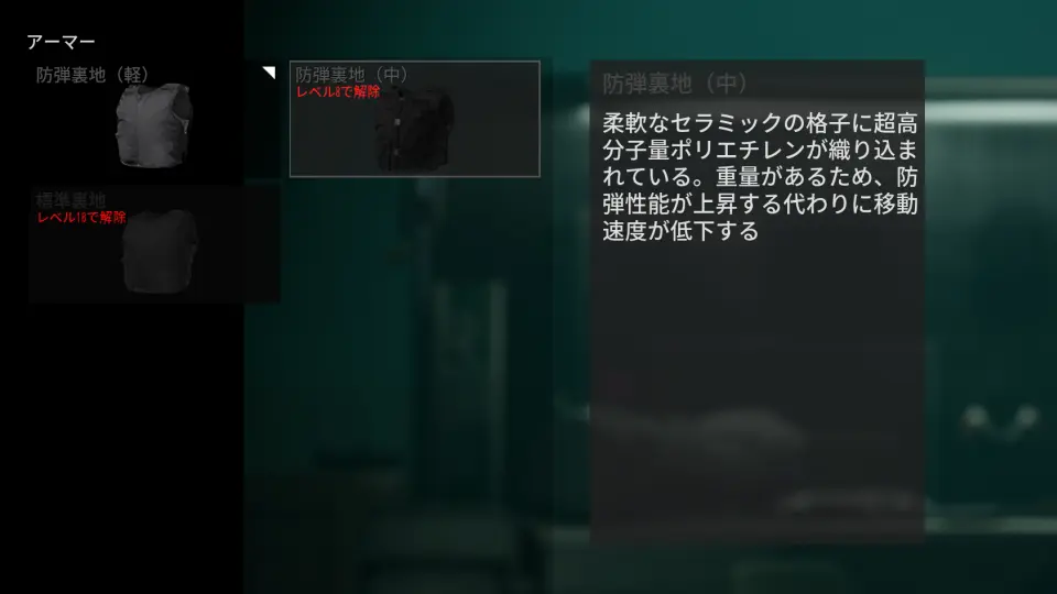 アーマーは敵の攻撃を一定量吸収してくれる防具で、ロードアウトから種類を選んで装備することができる。各アーマーの主な違いは移動速度と耐久度 (チャンク数) 、回復遅延*1、ダウン許容回数で、耐久度が高いほど移動速度とダウン許容数が低下する。