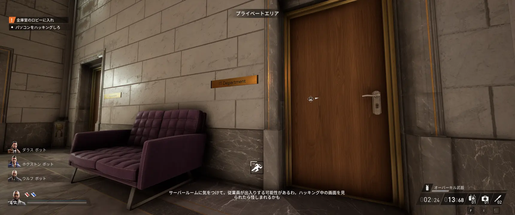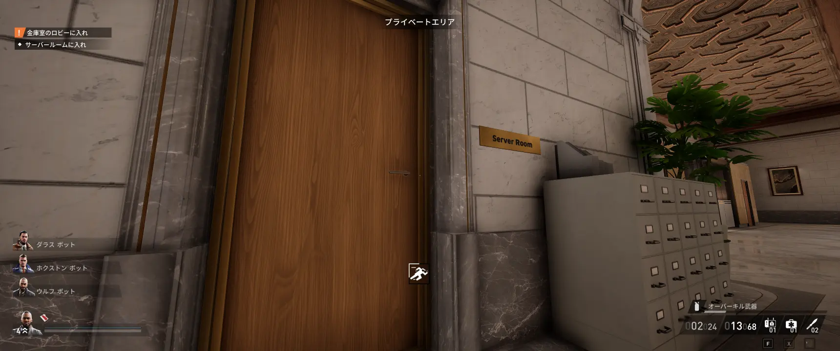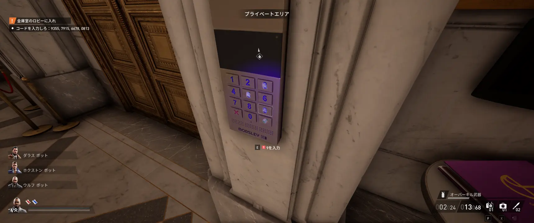 金庫室のロビーに入るには4桁の暗証番号を入手する必要がある。暗証番号は2階のサーバールームにあるPCをハッキングすることで手に入る。サーバールームは階段とは反対側の突き当りの左右どちらかにある。