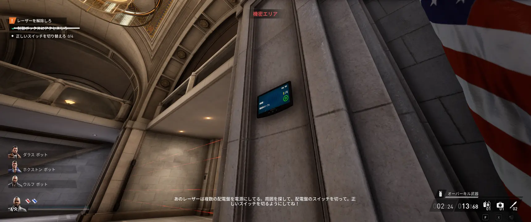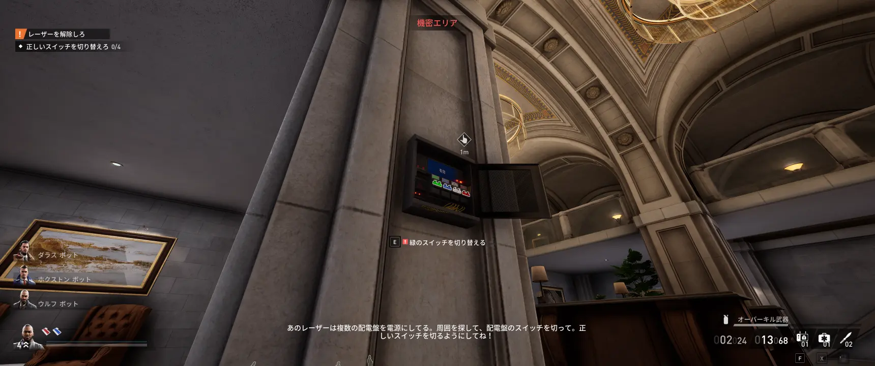残りの配電盤は、難易度NORMALであればすべて金庫室のロビーエリア2階にあるが、HARD以上の場合はロビーエリア外の2階に配置される。