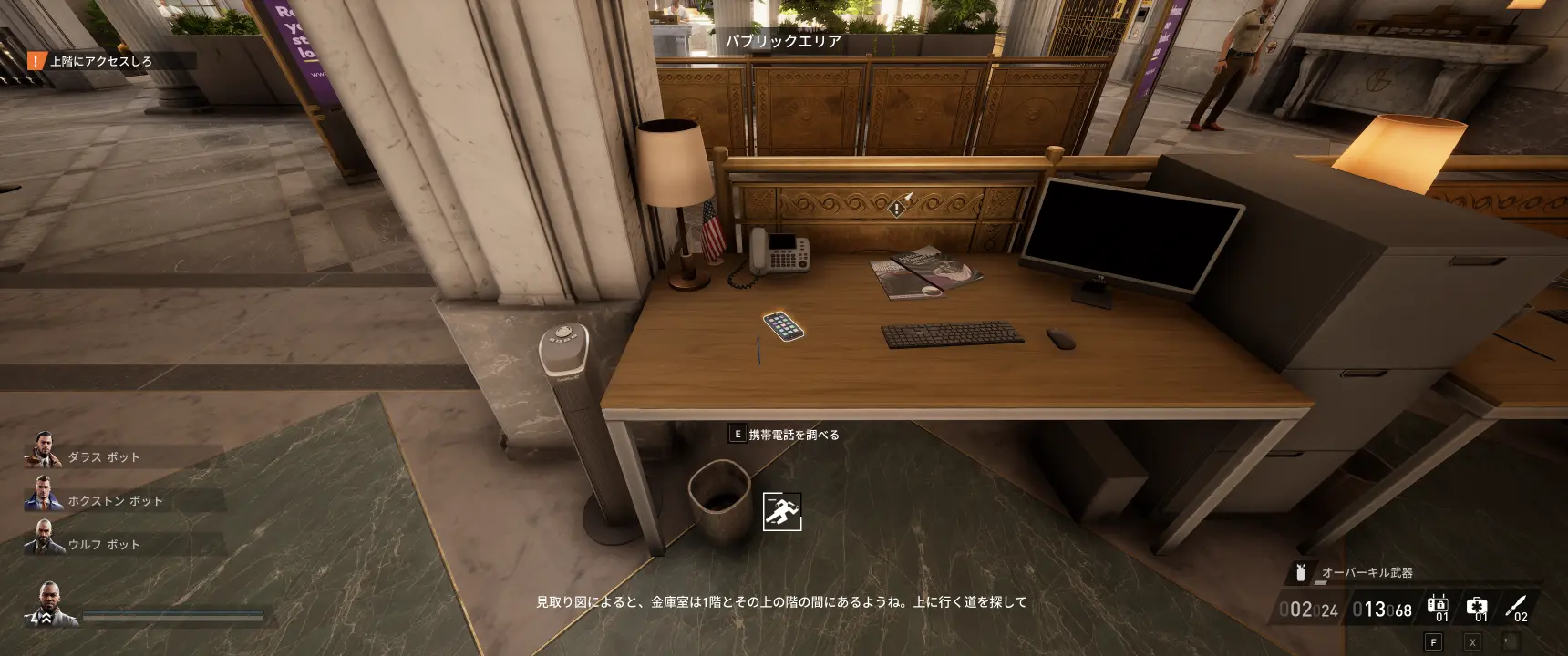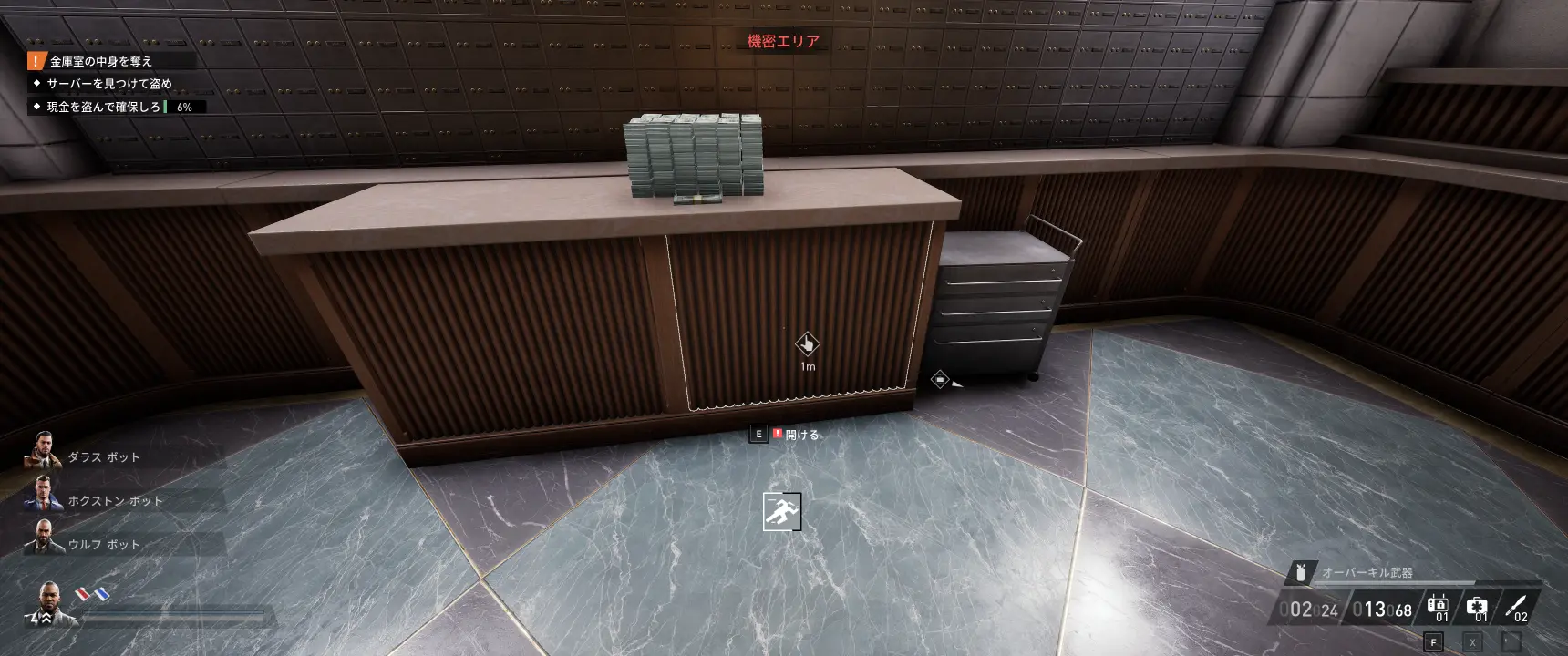 時間は十分にあるが、2人以上でプレイしている場合は、キーカードを持っているプレイヤーが支店長のオフィスを開けた後に金庫室前で待機し、他のプレイヤーにPCを操作してもらえば楽に金庫室を開けられる。