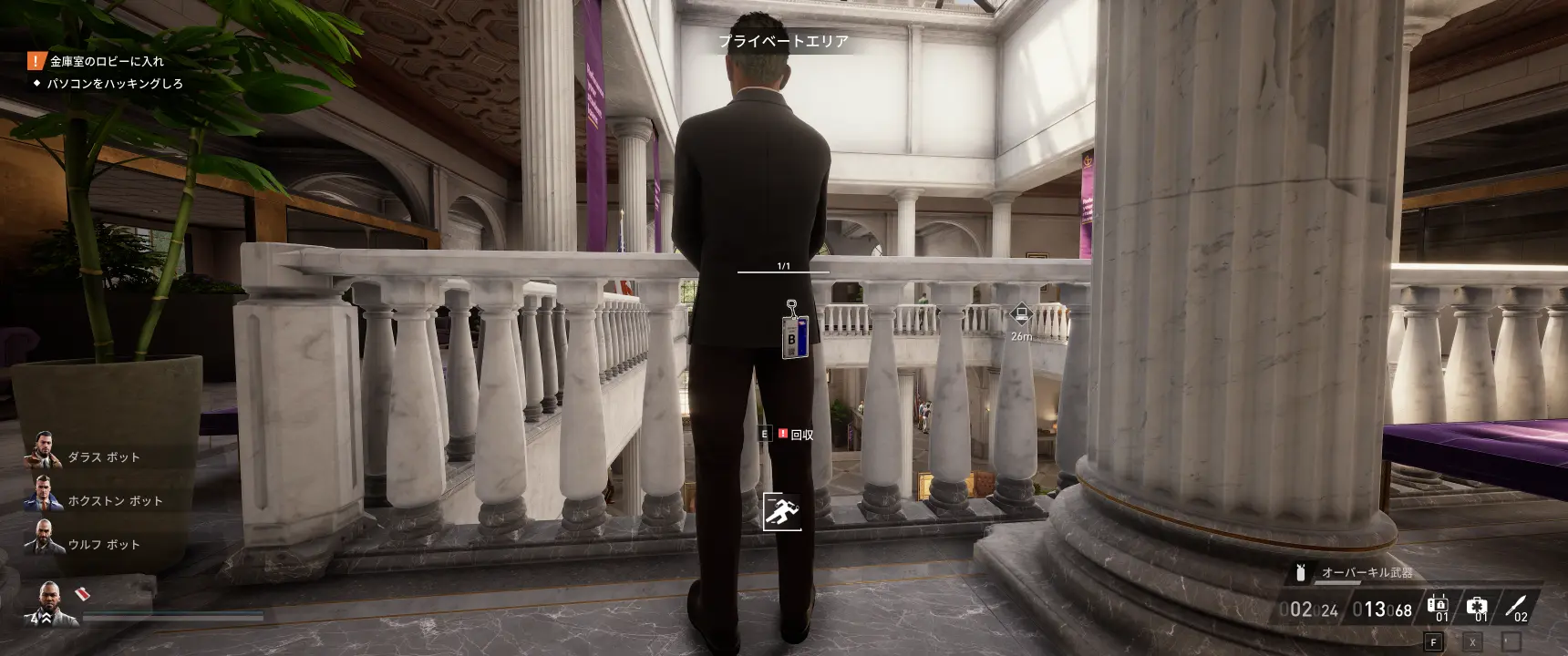 戦利品を詰めたバッグは地下のガレージに止まっている版まで運ぶ必要があるが、事前計画アセットで「エレベーターアクセス」を使用している場合、金庫室のロビーエリアにあるエレベーターにバッグを投げ入れればいいので非常に楽。