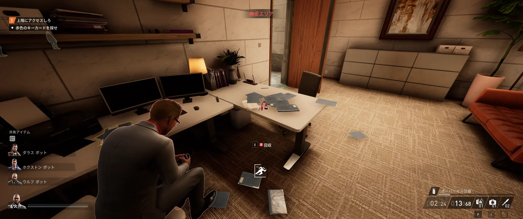 キーカードのあるオフィスの中には必ず行員がいるので、見るからないよう注意しながら書類の山やキャビネットを漁ってキーカードを手に入れる。