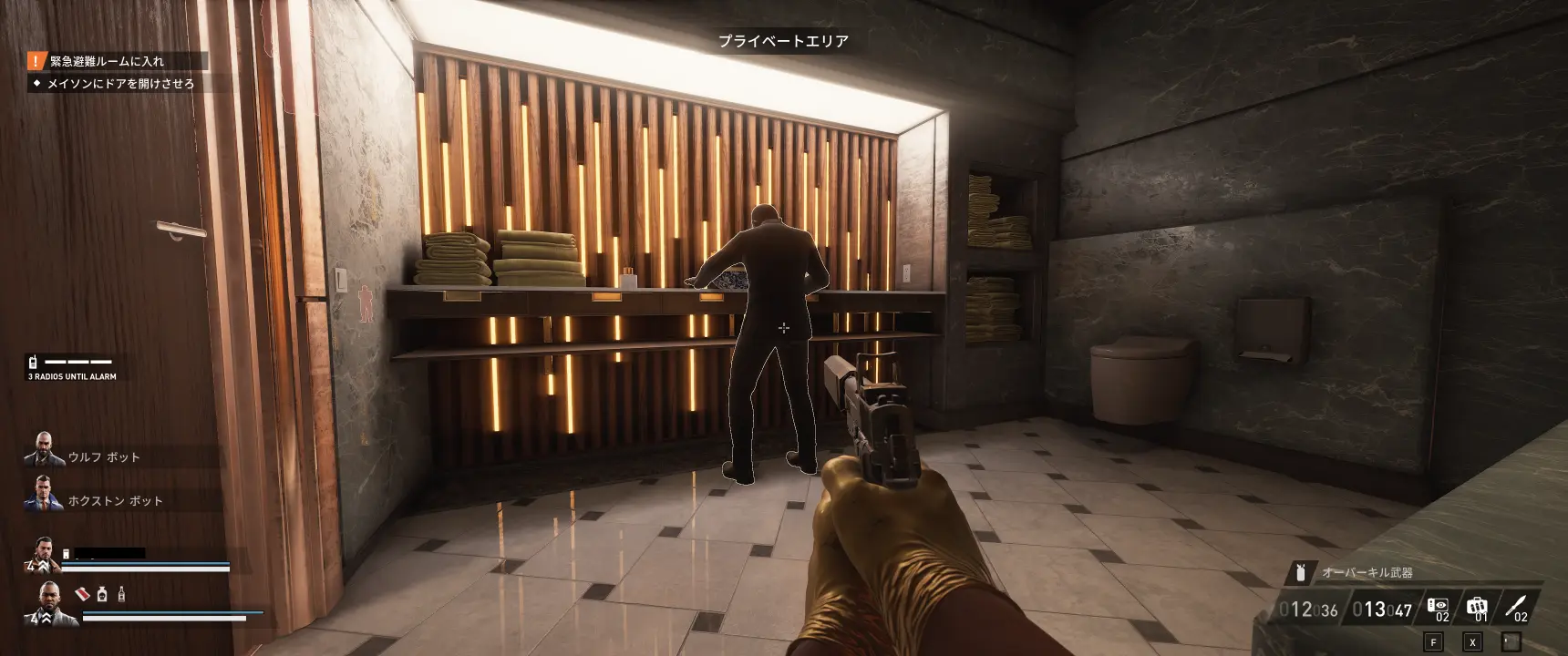 ペントハウスに侵入したら、入り口から見て2階の奥にある寝室へ向かい、入り口のパネルをインタラクトしてセキュリティの解除を行う。セキュリティを解除するには表示される円の中に一定時間留まる必要があるが、マスクを被っていると1階は動きづらいため、基本的には2階に表示されるの円を追うといい。