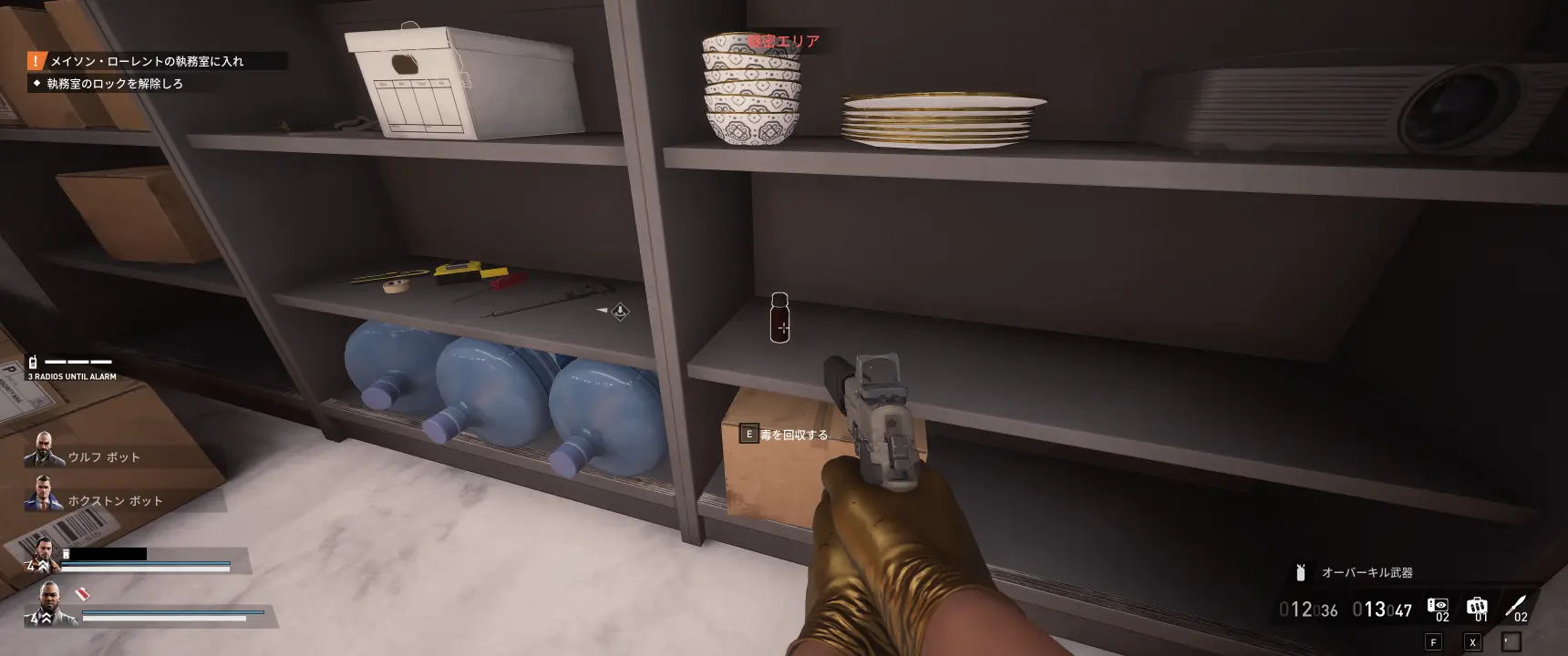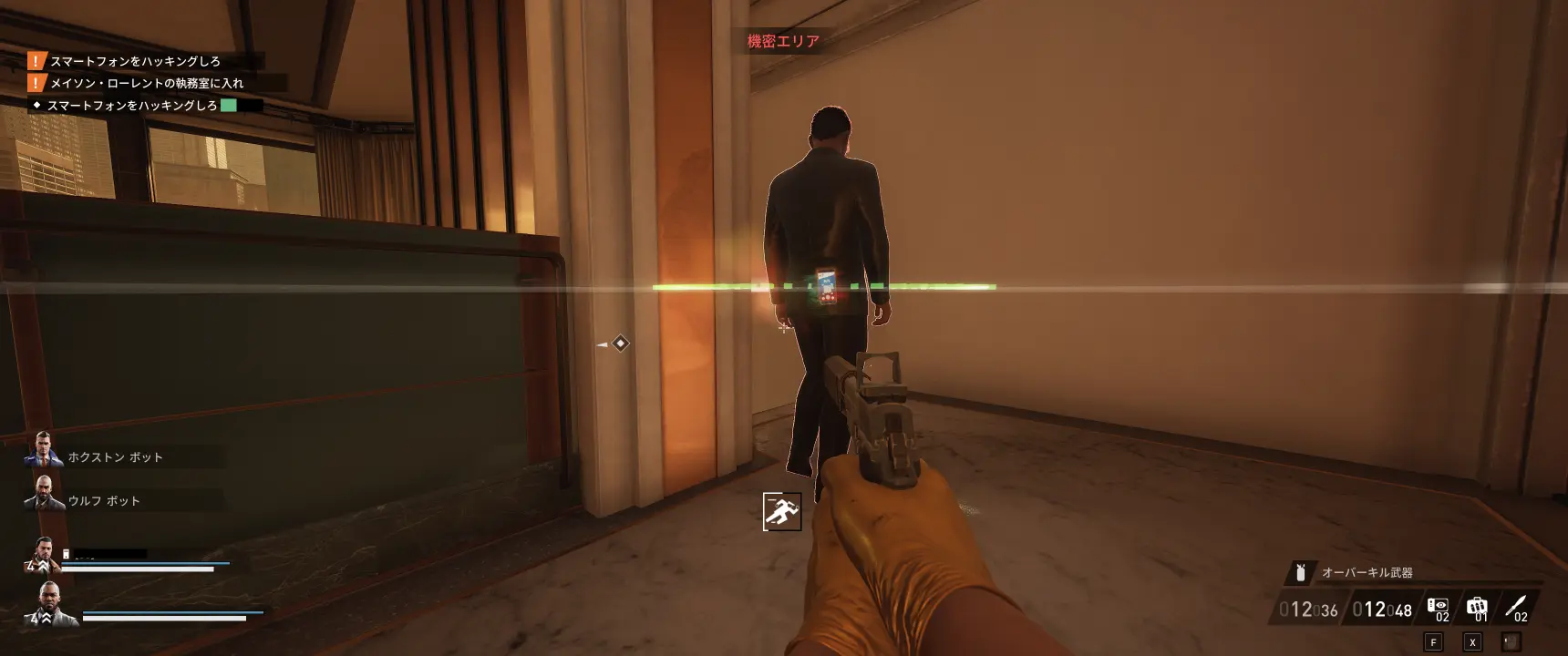 ハッキング中は警備主任から一定範囲以内にいなければならないため、一人になるタイミングを見計らってハッキングを仕掛けなければならない。警備主任が2階に上がってきたタイミングか、もしくは1階のキッチンに居るタイミングでハッキングを開始すれば、うまく最後までハッキングを終わらせることができる。