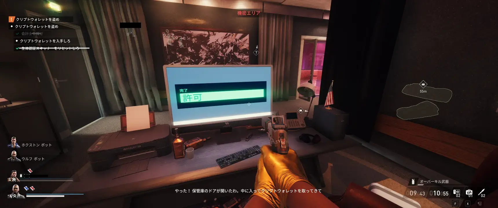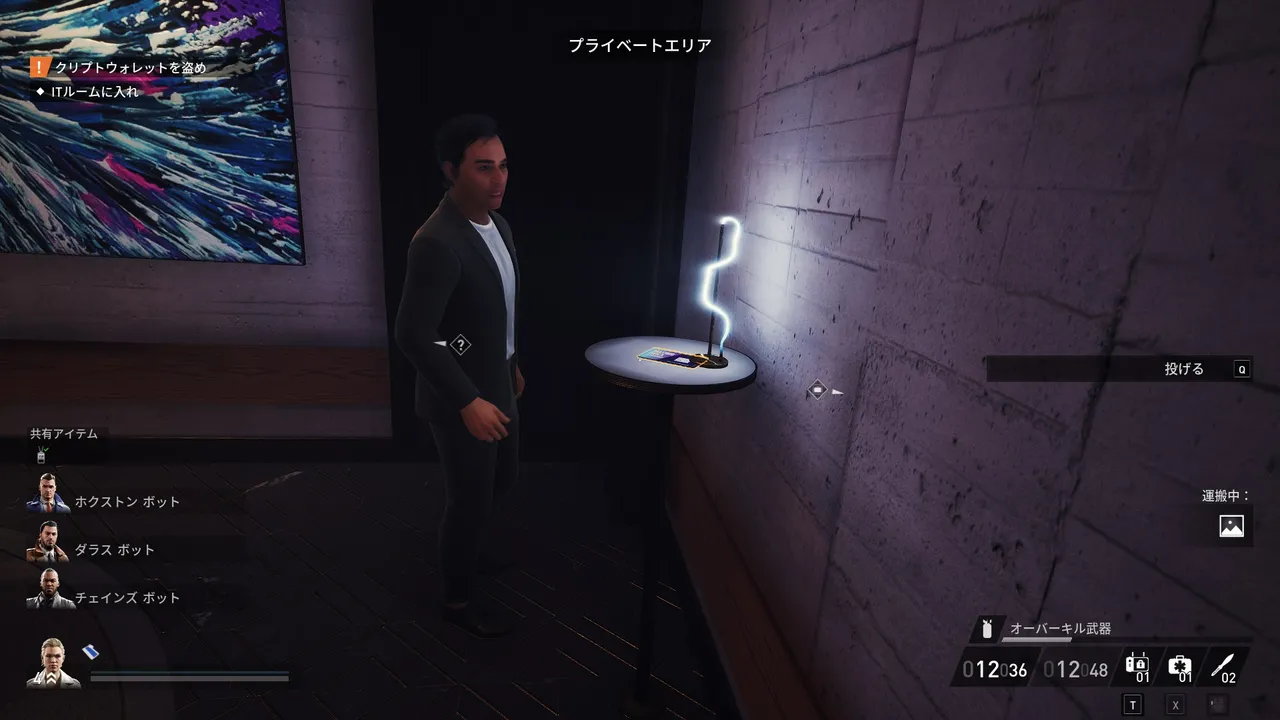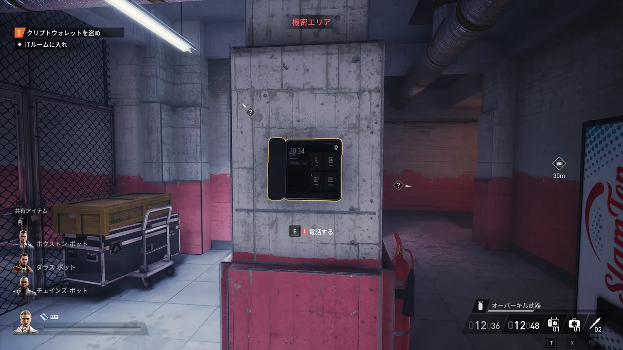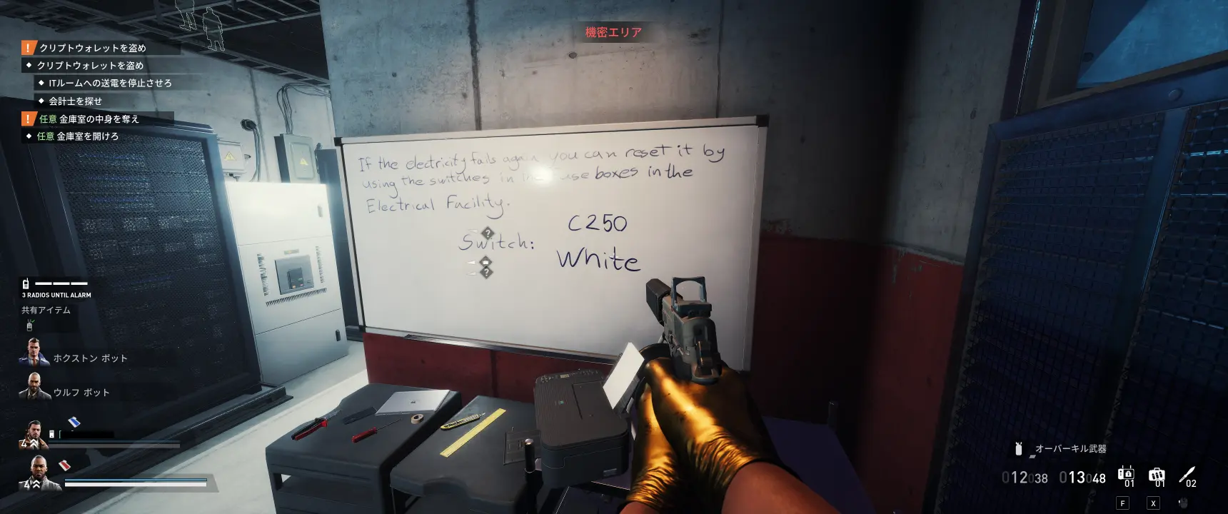 目標であるクリプトウォレットはVIPエリアのITルームに置かれているが、手に入れるには生体認証を突破する必要がある。突破方法としては、生体認証スキャナーをリセットするか、会計士をおびき出して生体認証スキャンをさせるかの2通りがある。