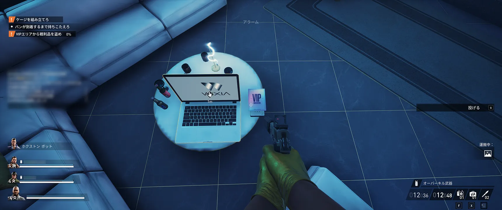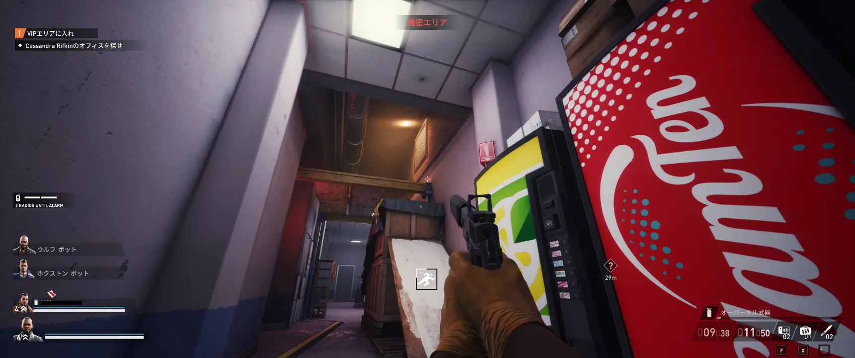 或いは、グリッチ・プロトコルで左の用心棒を妨害するだけでも良い。危なそうな位置と角度だが、盗むときもかざすときも右の用心棒には一切気付かれない。