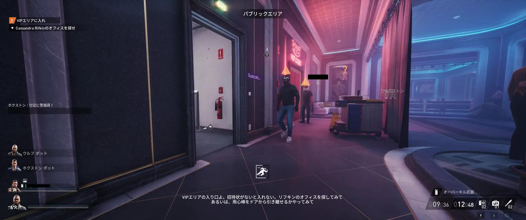 VIPエリアの扉のすぐ横にある部屋 (機密エリア) に入り、扉を開けた状態でダッシュして音で用心棒を釣る。気付いたのを確認したらすぐ店内に戻り、様子を見に移動している間にキーカードを盗んで扉を開けられる。