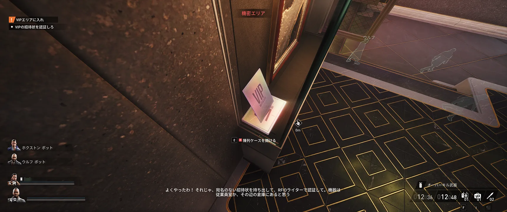 招待状を偽装してVIPエリアに入る場合、まずは2階にあるカッサンドラ・リフキンのオフィスに入り、PCをインタラクトする。するとリフキンがハイライトされるので、近づいてスマホのハッキングを行う。ハッキングが完了したら再びオフィスに戻り、入手した2次元コードをつかって招待状の入った陳列ケースを開けて宛名のない招待状を入手する。