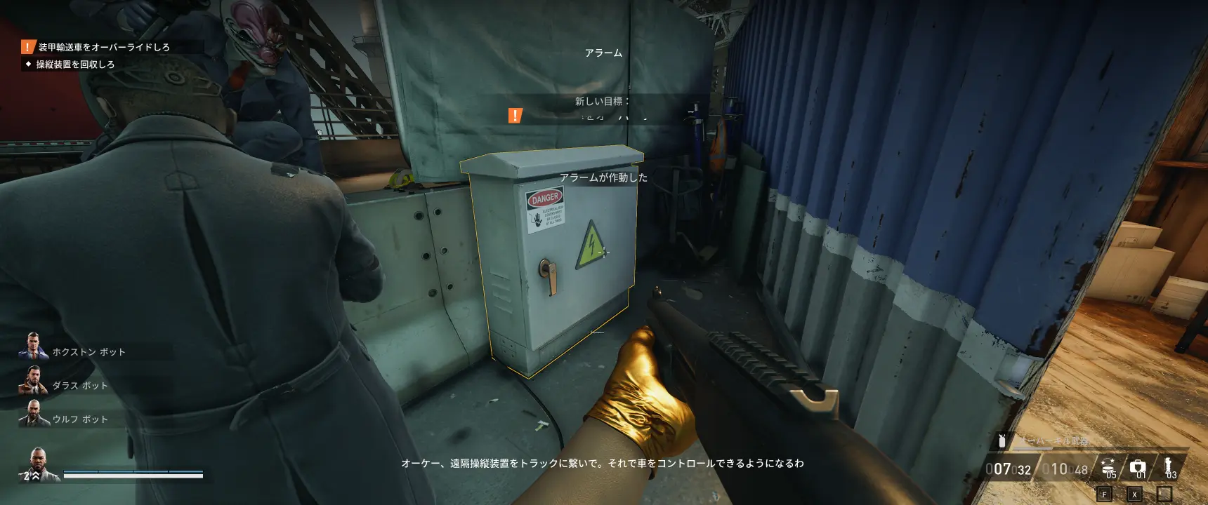 操縦装置はEMPの入って木箱と同じ見た目の木箱に入っており、3階建ての足場の下、シートのかかった資材の上、コンテナの中など建設現場のどこかにおいてある。装置の位置は輸送車を止めた後にHUD上に表示されるので、ざっと見渡して見つからなければ後回しにしておいてもいい。