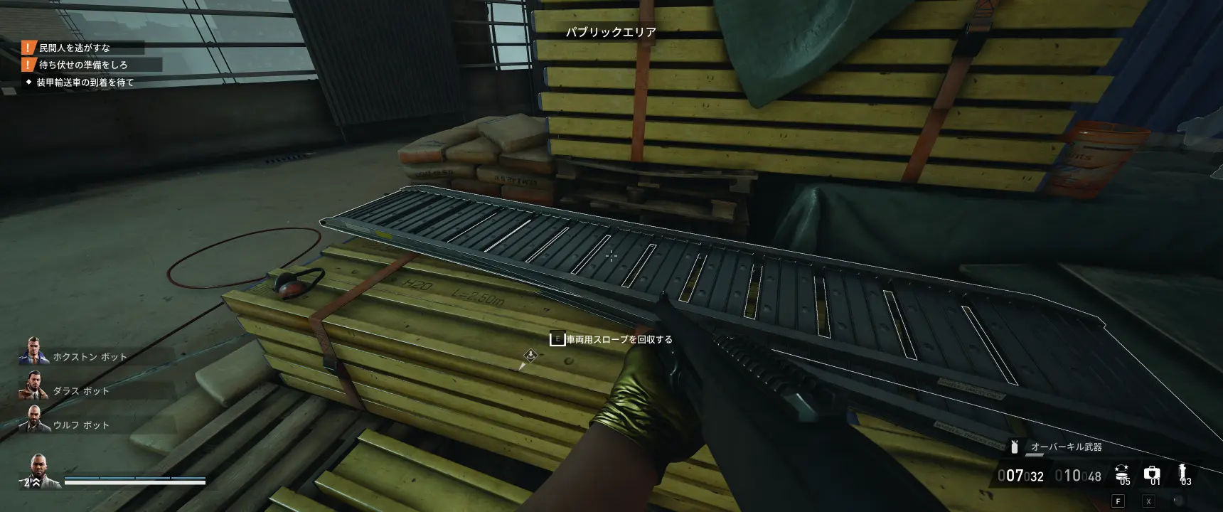 輸送車を誘導してスロープを登らせたら、まずは車両の下に潜り込んで底部のハッチにドリルを設置する。なお、この時点から逃走するまでのほとんどの時間をスロープ周囲で過ごすことになるため、設置型アイテムを展開するのならこのタイミングがいい。