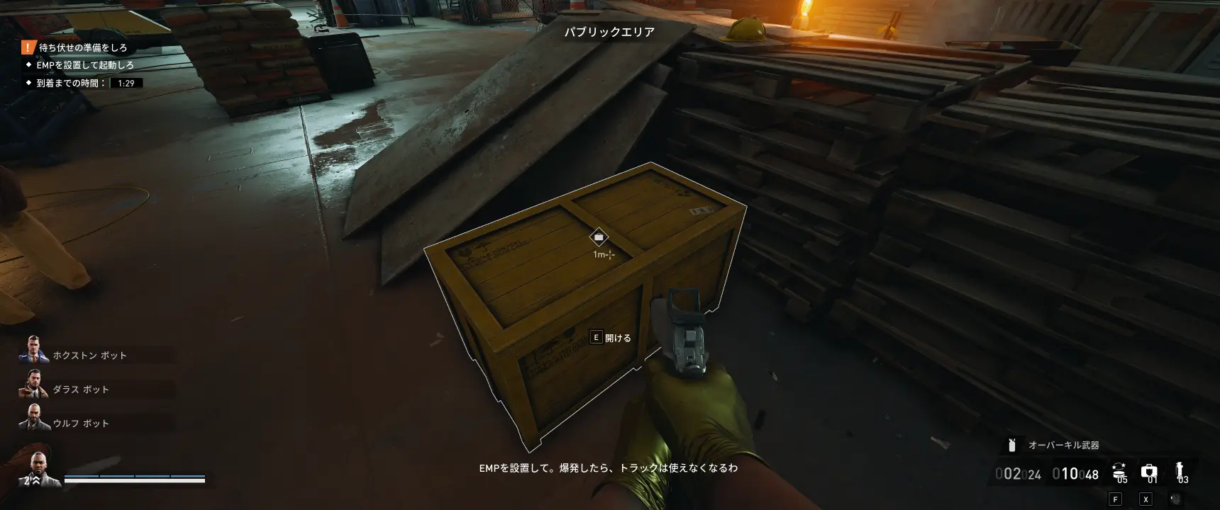 ジョブが始まったら、まずは目の前にある木箱を開けてEMPを回収し、指定の位置まで持っていく。指定位置にEMPを設置したら、インタラクトして起動する。EMPの設置と起動は1分30秒以内に終わらせておく必要がある。