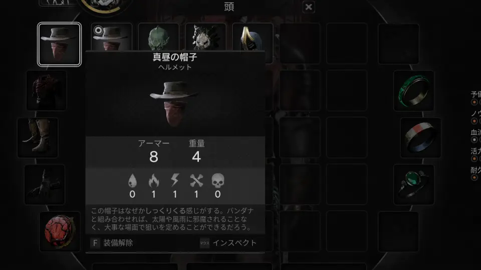 前作では同じ種類のアーマーを装着することでボーナスを獲得できたが、今作ではそういったボーナスはなく、アーマー値と重量、そして各種属性の耐性で装備するアーマーを好きに組み合わせることができる様になっている。