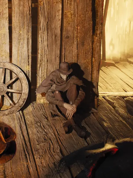 収穫者の手の届く範囲入口付近で膝を抱えて嘆いているドランの男。妻のドリアを探している。