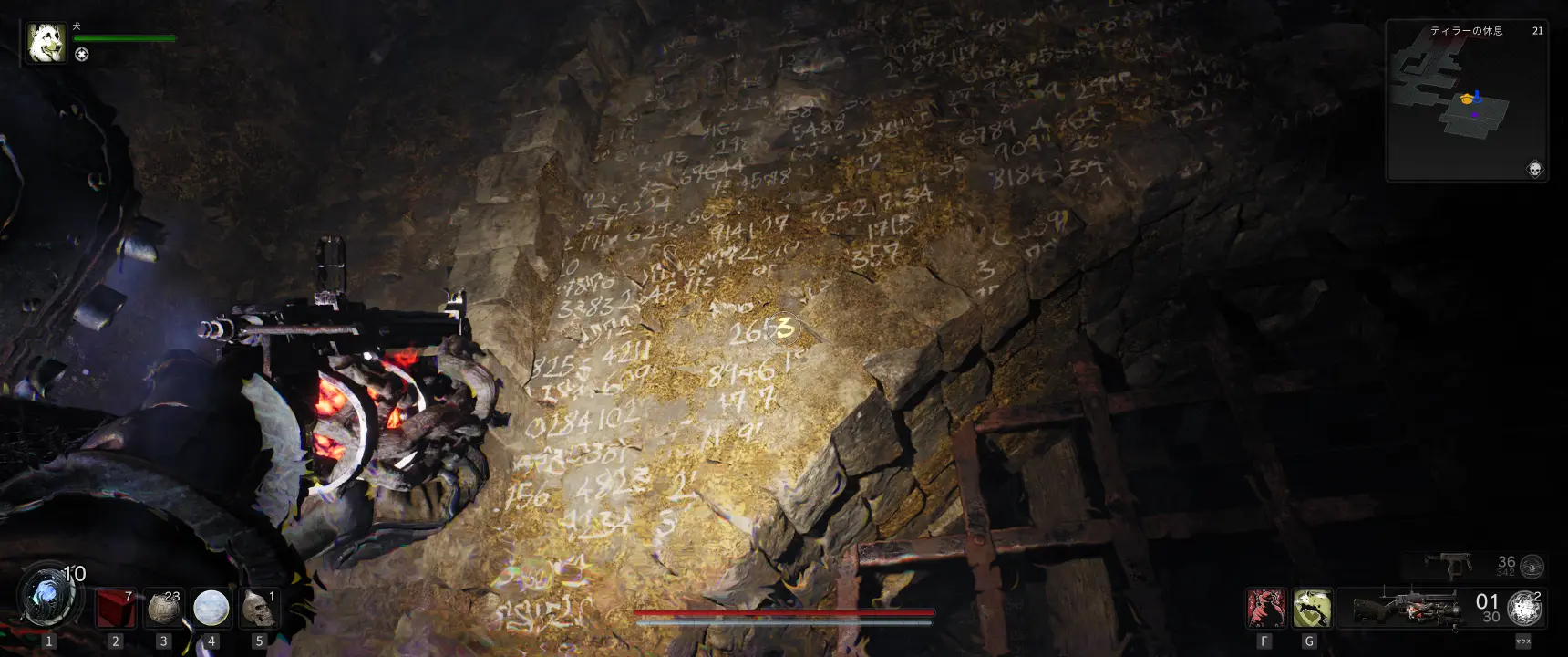 レソムの下水道ダンジョン (大下水道、収穫者の手の届く範囲、ティラーの休息) でランダムに発生するイベント。金庫の置いてある部屋の壁一面には4桁の暗証番号が書かれている。