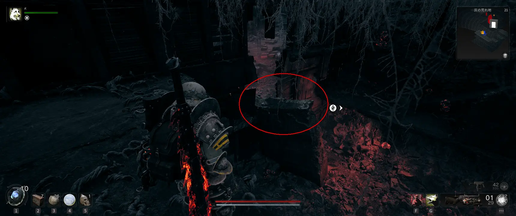 広場に降りて左奥に進むと最初のワールドストーンがある建物の下まで行くことができ、壁に開いた穴から建物に入れる。建物に入ったら壊れた床づたいに上へ登り、外に続く塀の上にジャンプすると樹枝状セットとスチールカタナが落ちているのが見える。また、そこから建物の2階部分へジャンプすれば指輪の収穫の石が拾える。