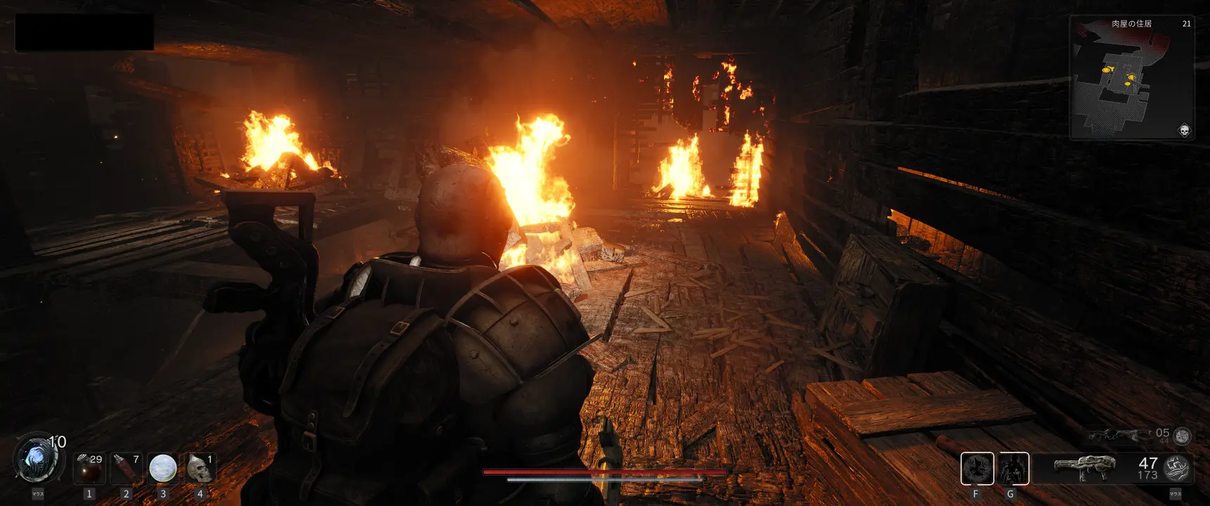馬車の残骸がある広場から少し進んだ高台にある家は、足場伝いに上がって中に入ることが出来る。中はあちこちが燃えていて燃焼を受けやすいため注意しよう。また、タールまみれのドランも何体か潜んでいる。