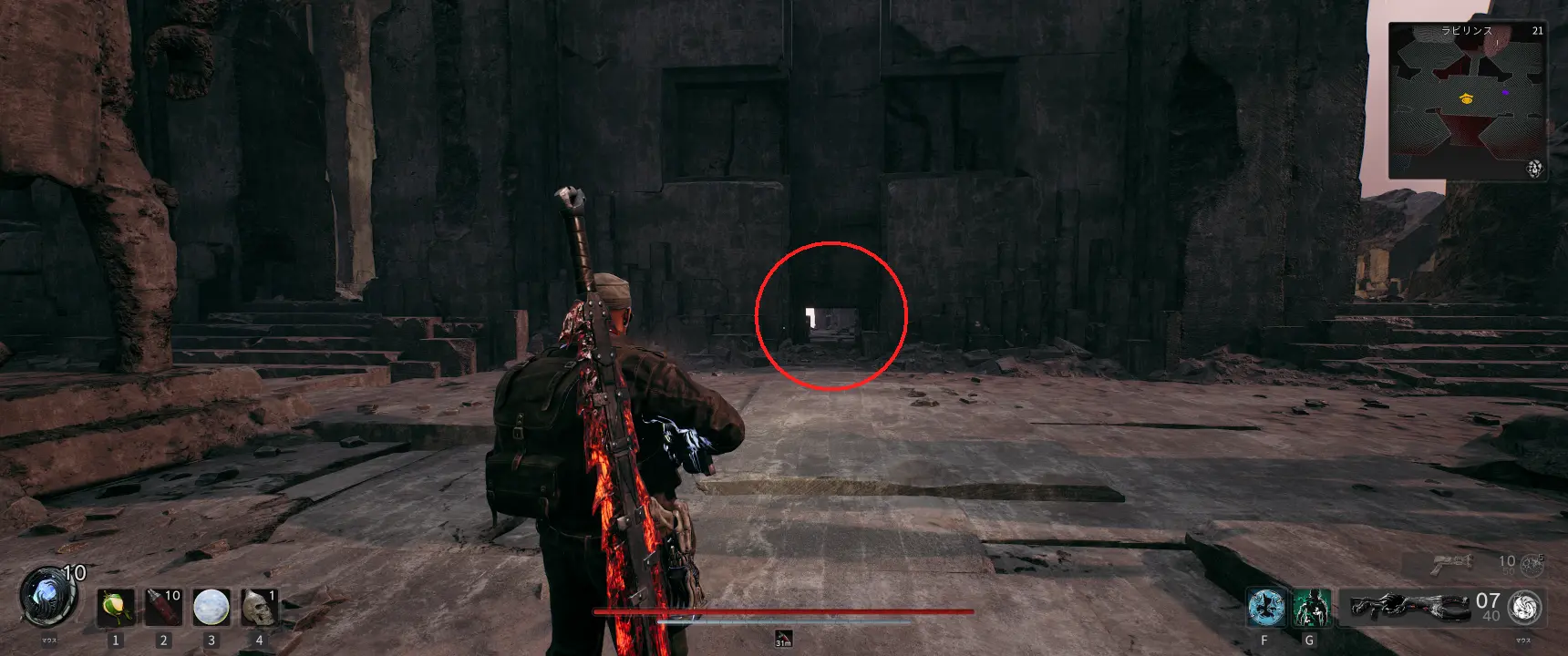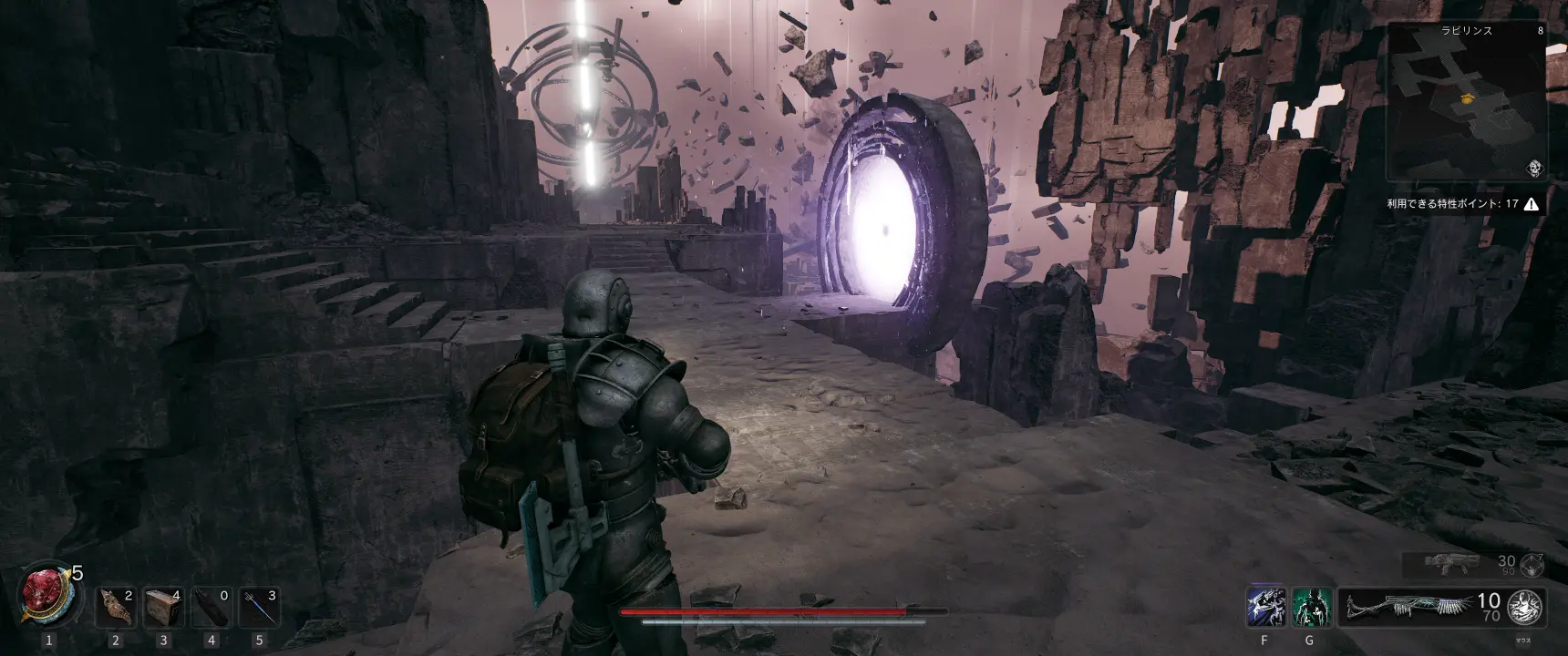 ラビリンスの破砕した入り口から絡み合ったガントレットへと繋がるポータルの後ろから崖を覗くと、宙に浮かんだポータルがあるのが見える。このポータルに入って進むと、ラビリンスの歩哨との戦闘エリアの裏側に行くことができる。