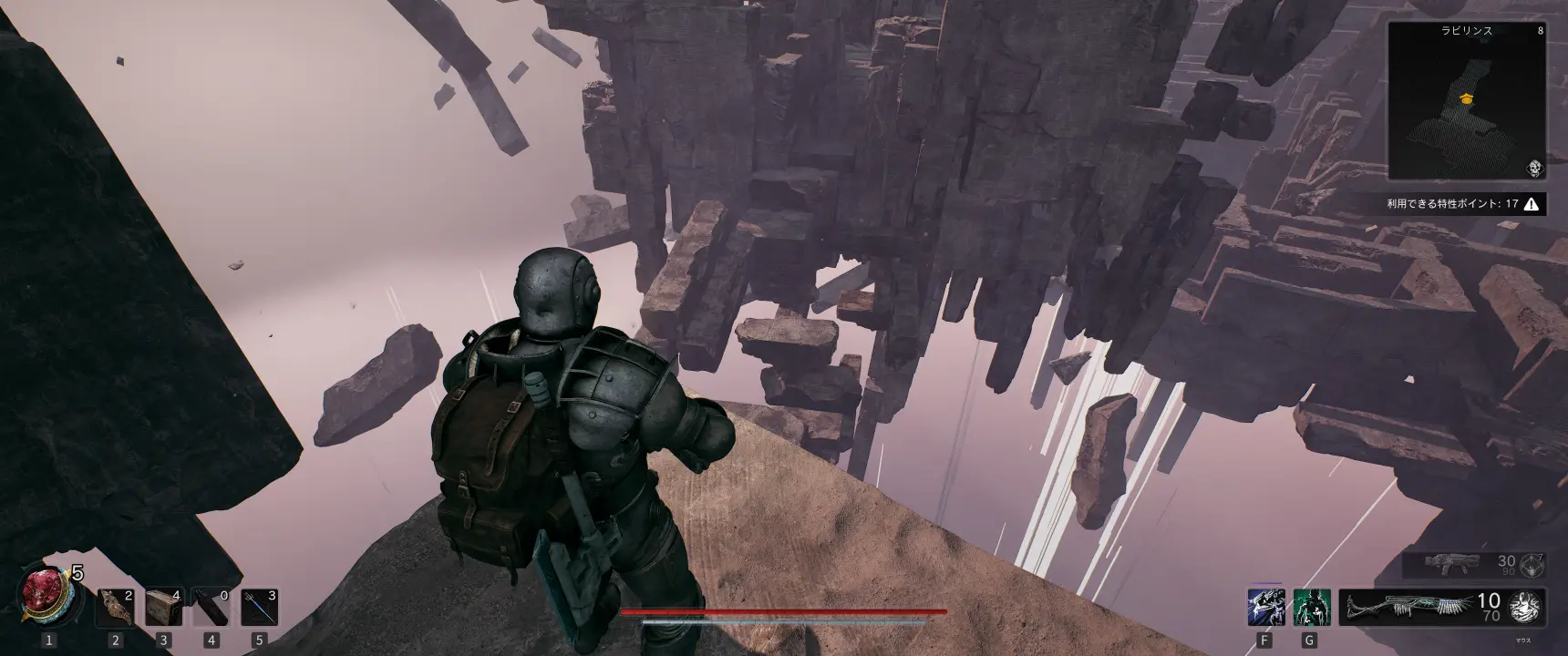 少し進むと断崖になっているが、一定間隔で消える足場が出現するので、これを使って向こう岸に渡る。渡った先を少し進むと開けた場所があり、奥に杖が置いてある。なお、杖に近づくとアベレーションの要塞が出現する。要塞を倒すとミューテーターの復讐の一撃が手に入る。