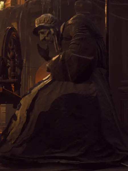 オラクルの避難にある建物の中で機織りをしている老婆。周りには多くのドランの子供たちがいる。