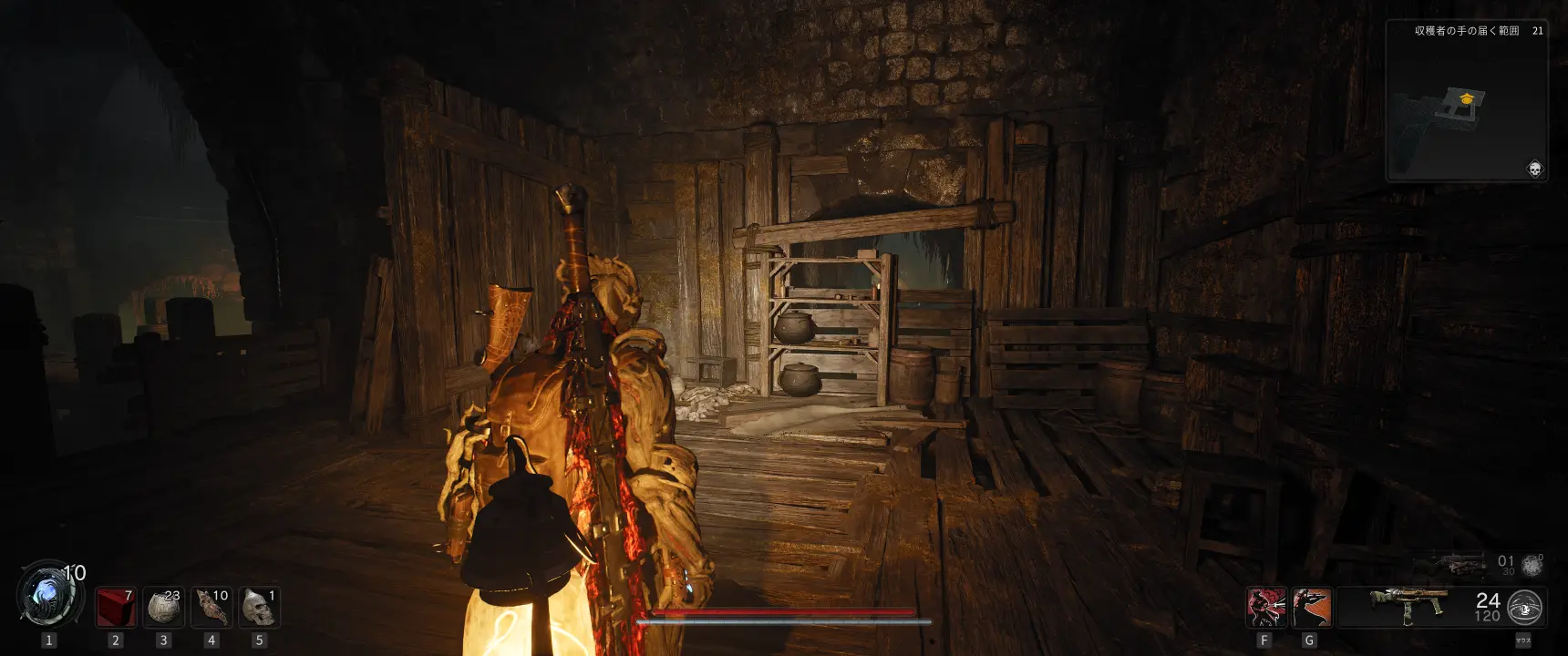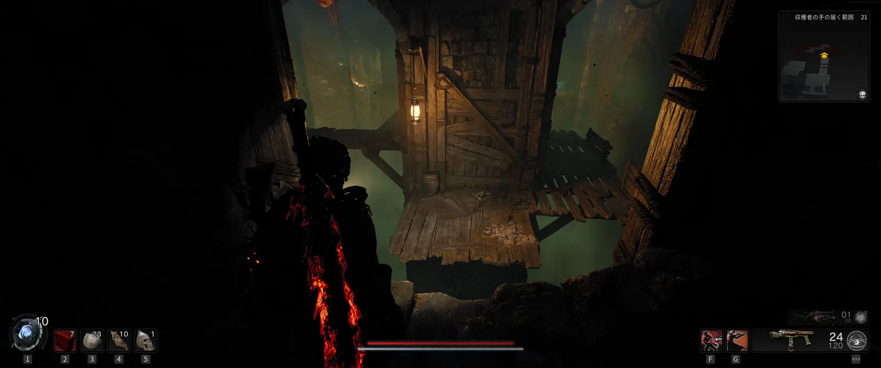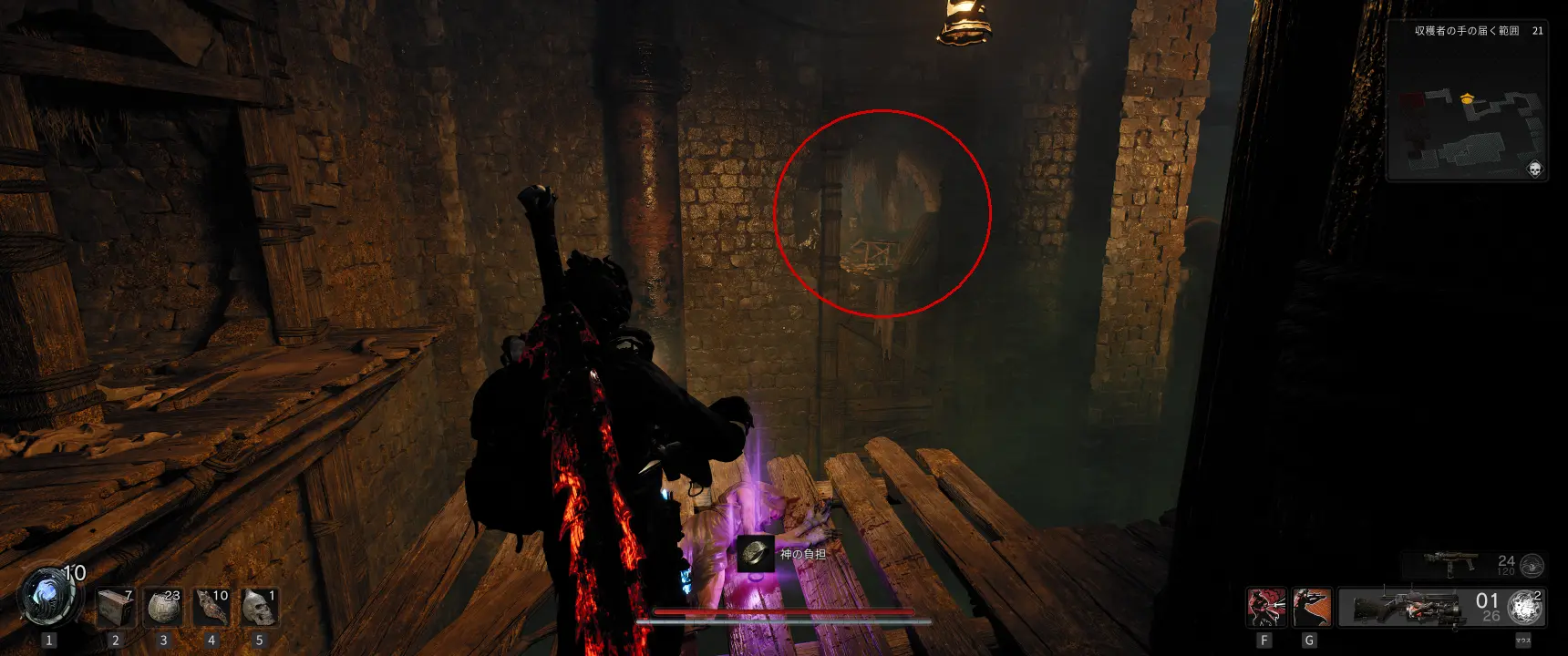 下水道の壁沿いを探すと画像のような木の板で塞がれた道が配置されていることがあり、破壊して奥へと進むとまばらに足場が配置されたエリアに出る。足場から落ちると死亡するので注意。