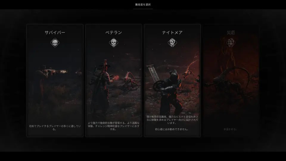 『Remnant 2』では全部で4つの難易度が用意されており、初期状態ではサバイバー、ベテラン、ナイトメアの3つが選択可能。一度ゲームをクリアすると、さらに上の難易度である災厄が解放される。