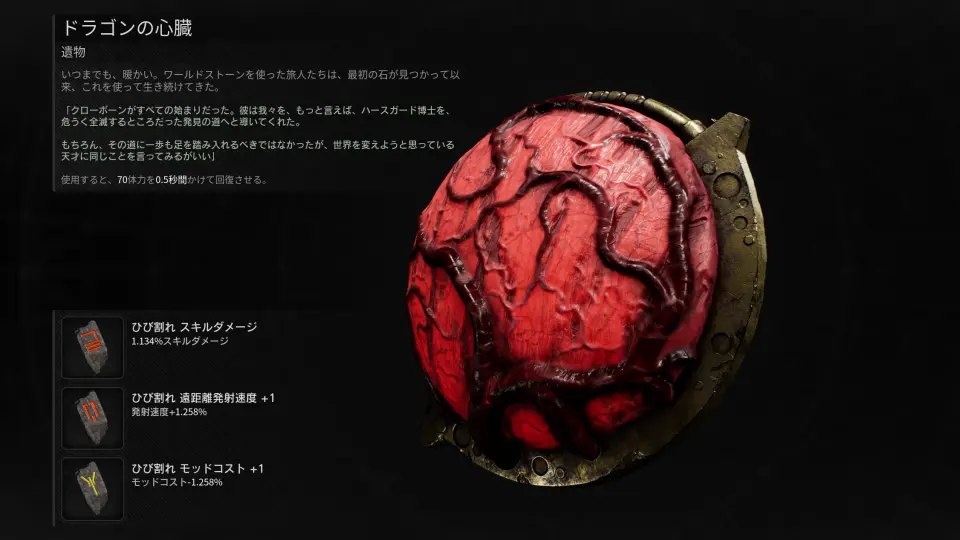 ![]() 回収された心臓 | 固有の使用速度ボーナス50%。使用すると、0.25秒かけて、体力を30回復し、現在の体力 (灰) の300%を回復する。 | ネルードの昇華の尖塔にあるドラジールのレプリケーターでクラフトする。 |