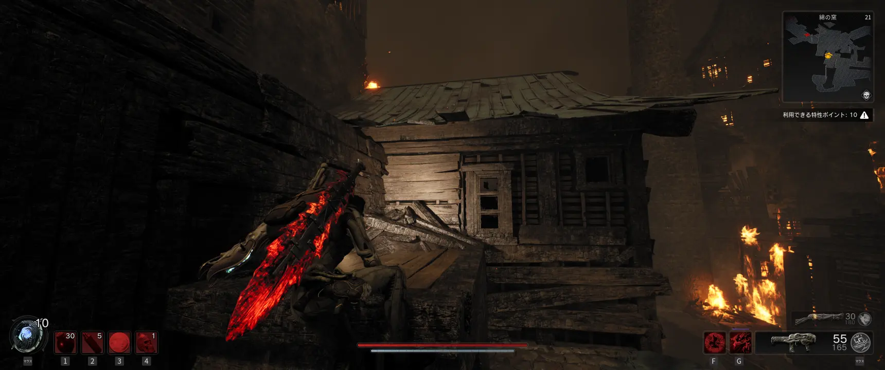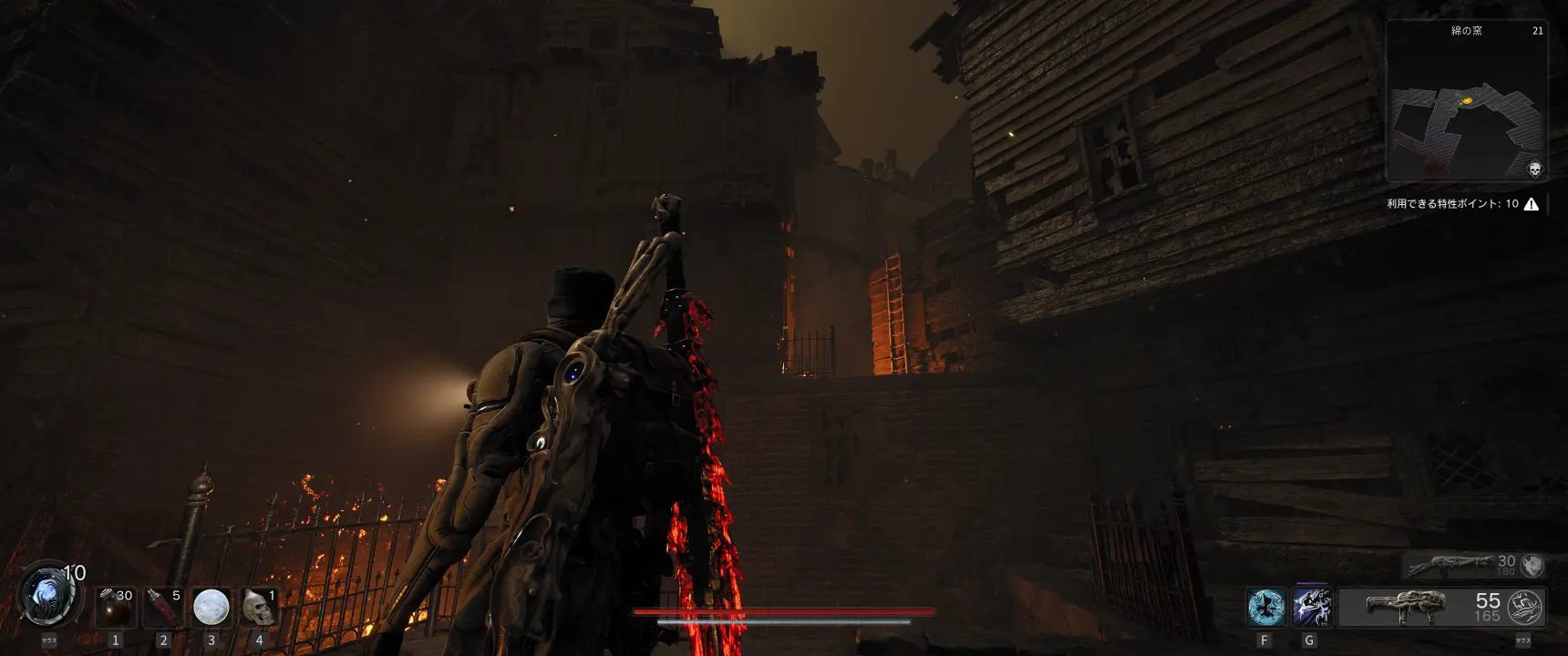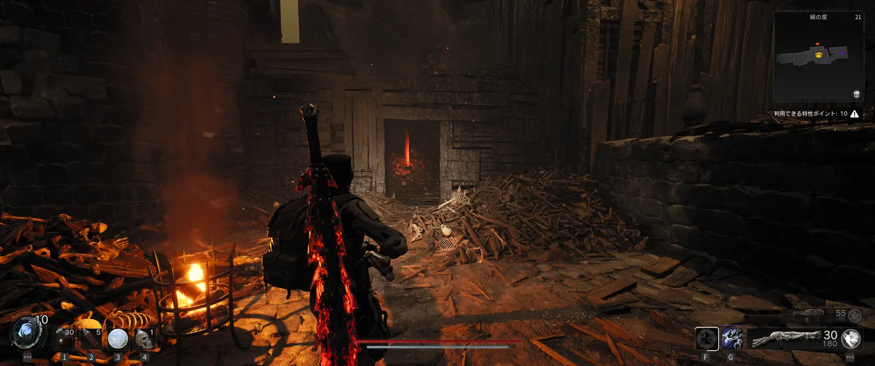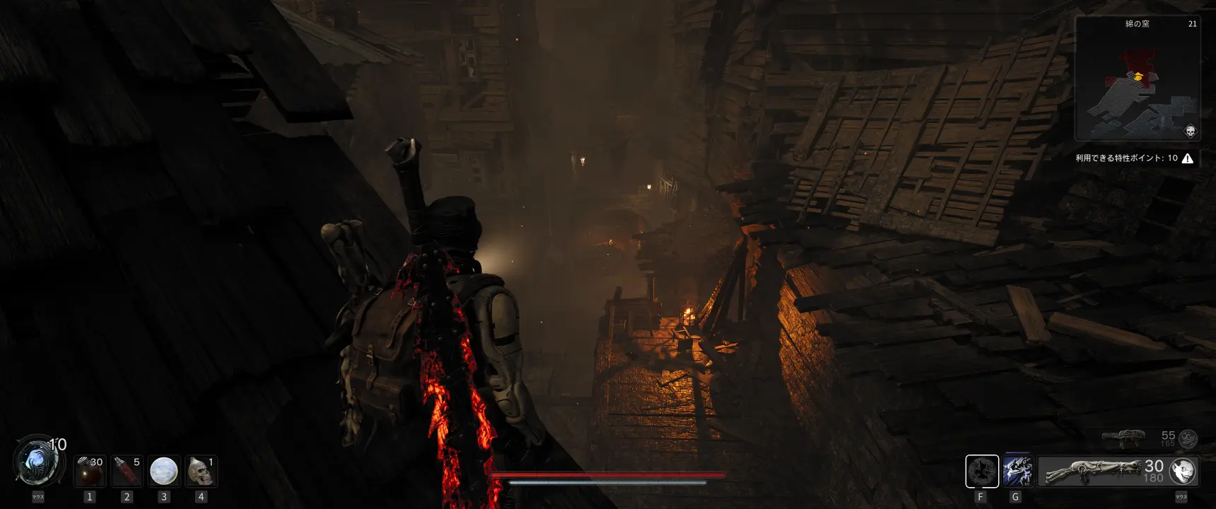 抜け穴を通った先にあるハシゴを登り、屋根によじ登って進むと、屋根から路地裏に降りられる。路地裏には骨と材木でできた巣がいくつもあり、その周囲にカラスも止まっている。この巣に触れると周囲のカラスが一斉に襲ってきて大ダメージを受けるため、なるべく触れないよう慎重に奥へ進んでいく。