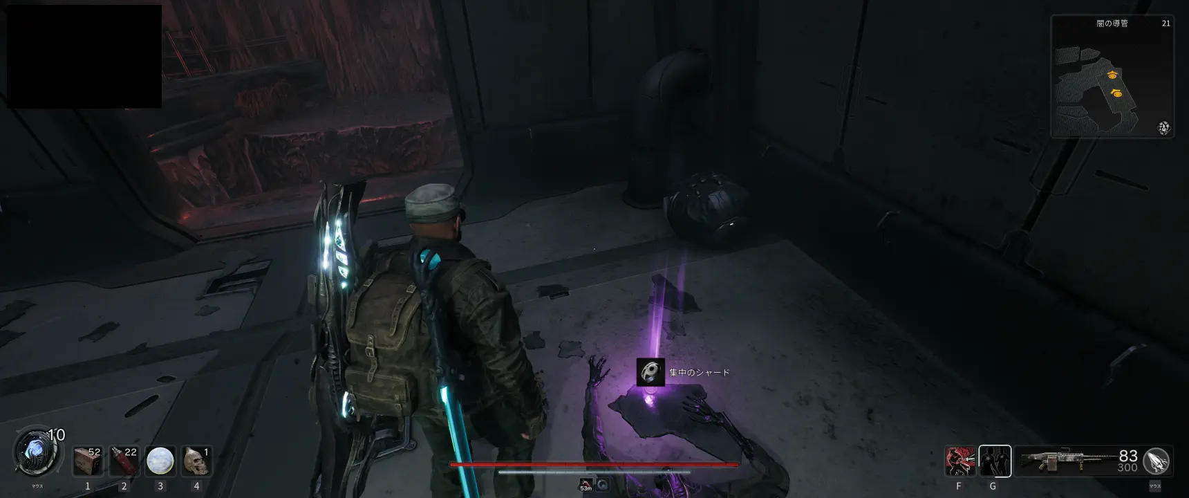 ダンジョン内にある壊れた列車の車両を通り抜けると、開けた場所に謎の球体と偏向の指輪が落ちているのが見える。また、球体の奥の道から続く別の車両の内部には集中のシャードがある。