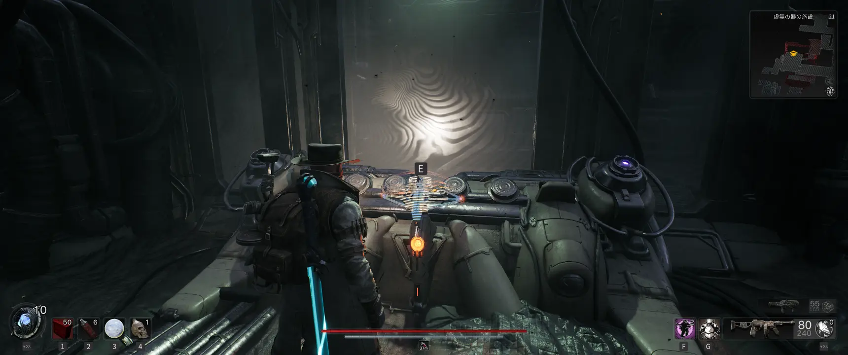 ダンジョン内にガラス張りの水没した部屋があったら、まずは近くにあるエレベーターを使って地下に降りる。地下は水浸しになっており、数体のロボットがいる。大きなエアロックの扉は一旦無視して奥まで進み、はしごを登った先には操作可能なコンソールがあるのでこれを使用する。すると部屋を満たしていた水が抜け、先程地下にあったエアロックから水没していた部屋に入れるようになる。
