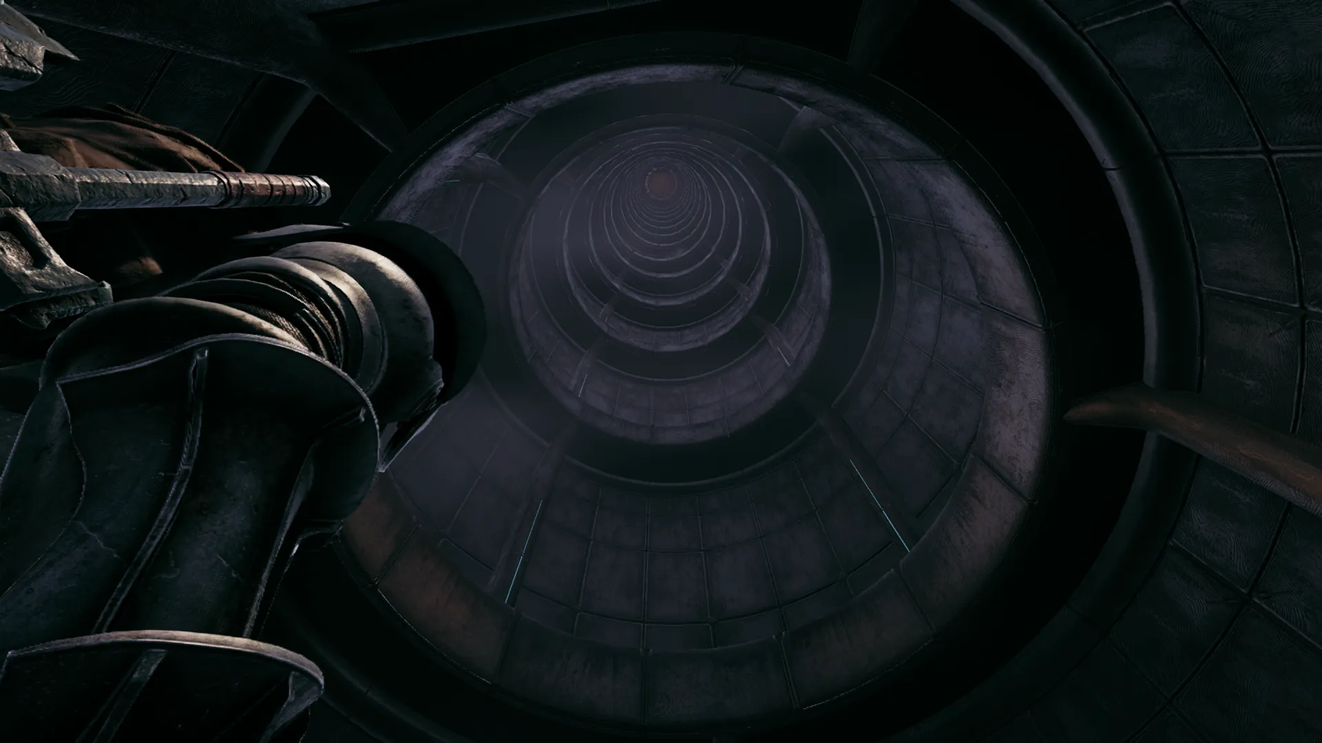 上記の条件を満たしている場合、画像のような長いエレベーターの途中の壁に穴が空いており、飛び込んですぐの小部屋にロボット2体と低収量回復の指輪がある。少し進むと下層に戻るためのエレベーターがあるが、これに乗ってすぐ降りると上から別のエレベーターが降りてくる。こちらに乗ると上層の推進ループが落ちている場所に辿り着ける。