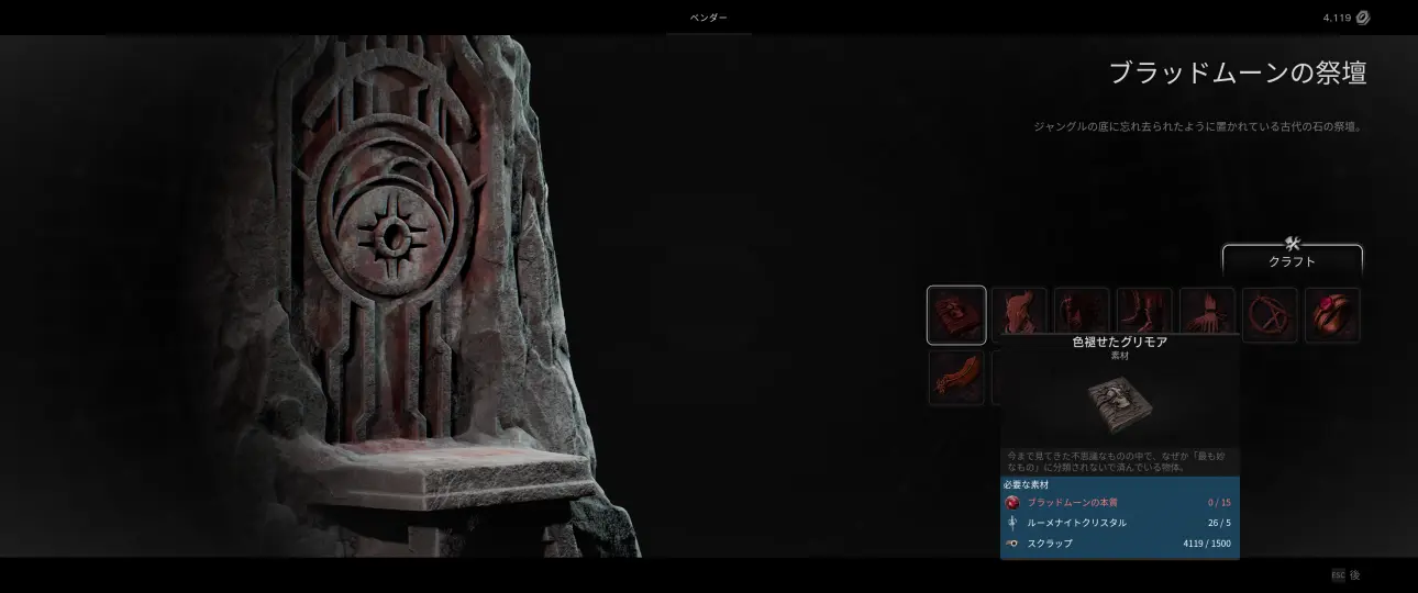 ブラッドムーンの祭壇はヤイシャのはるかな森や禁断の木立に配置される特殊なクラフト用ベンダーで、アイテムのクラフトにはブラッドムーンの本質が必要になる。