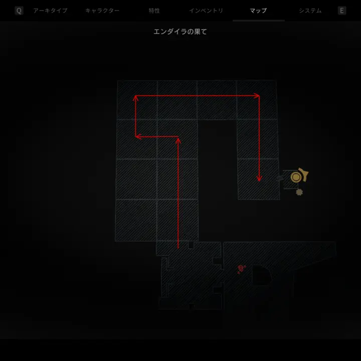 最奥にあるエンダイラのエンドレスループが置いてある部屋で、右手側の壁の前に立つと圧力板が反応して壁が上に上がる。その先は4x4のマス目上に並んだ部屋を特定の手順で進んでいくパズルになる。