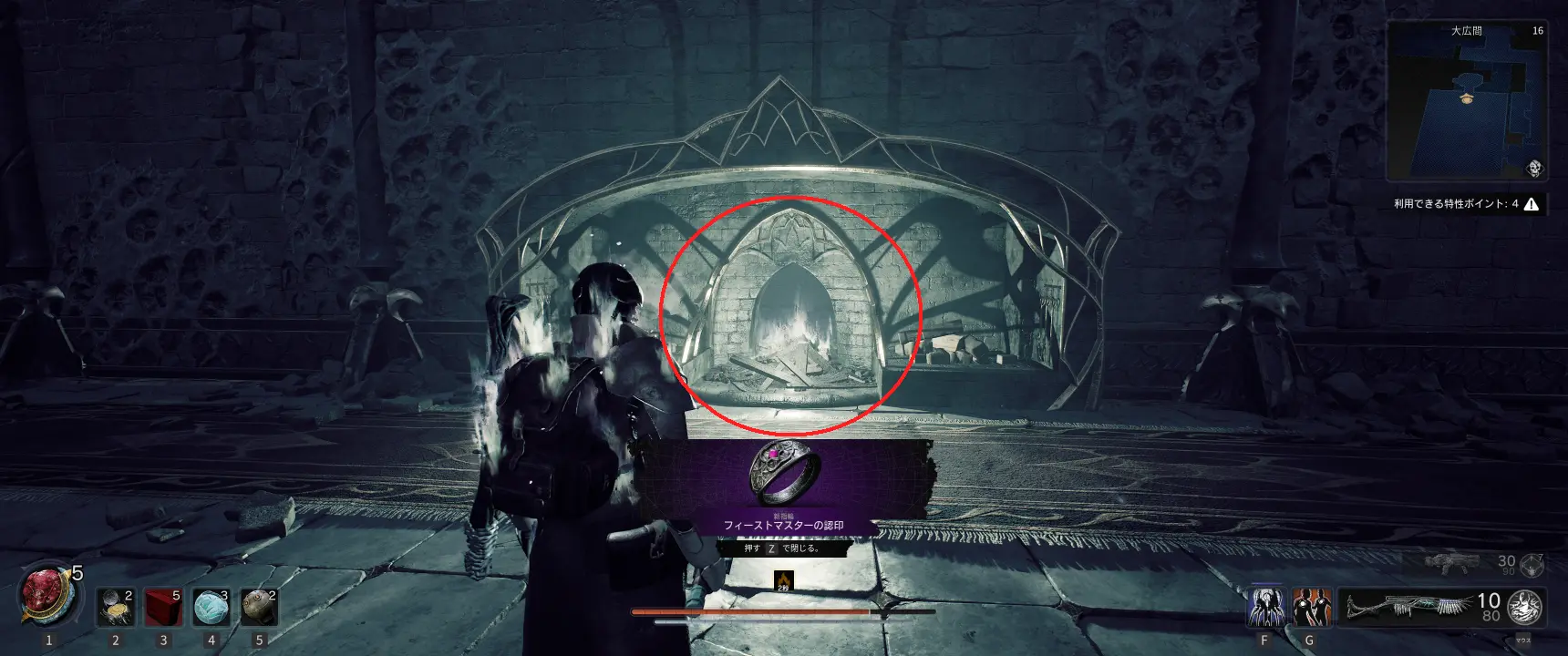 扉を開けた先は大きなテーブルのある広間になっている。部屋の隅には暖炉があり、しゃがんで暖炉の裏側に入るとフィーストマスターの認印を入手できる。