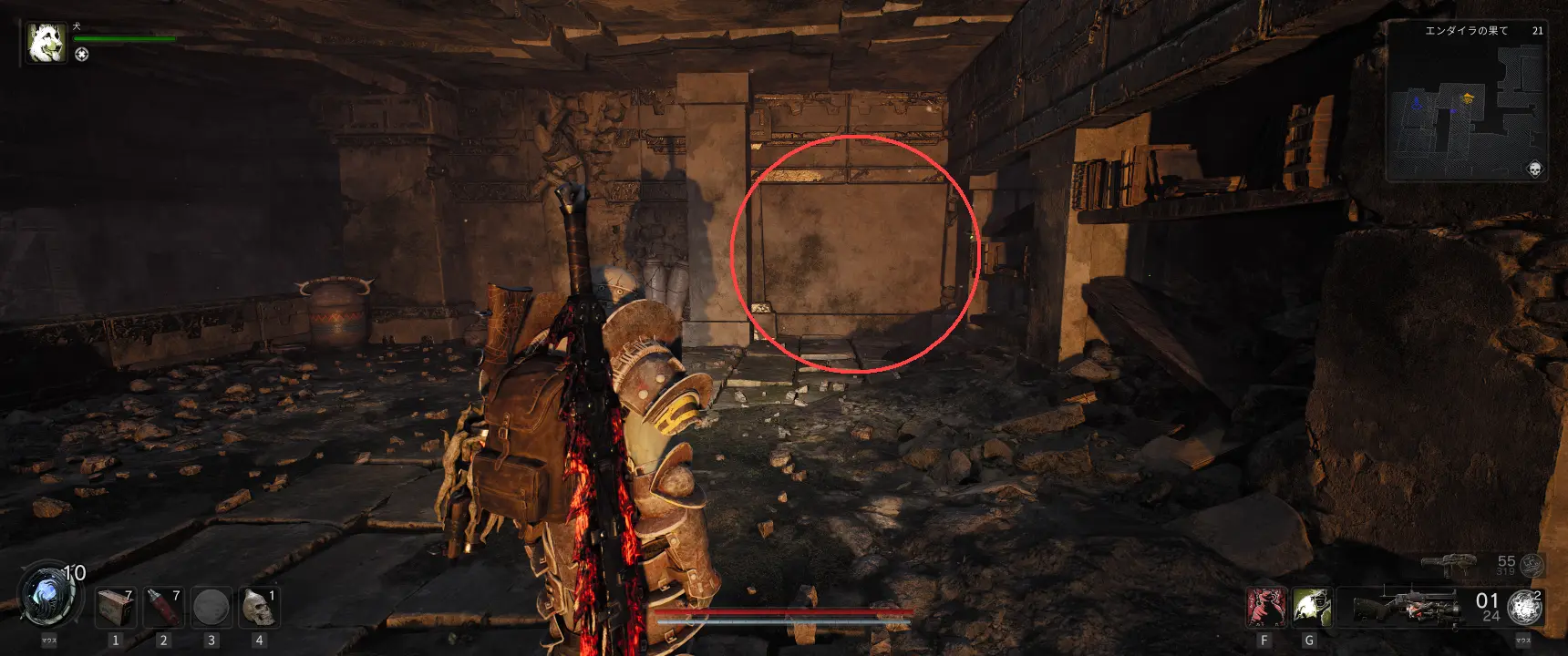 従者の負担がある部屋で帰りのハシゴとは反対の壁の前に立つと、圧力板が反応して隠し部屋へと繋がる通路が現れる。部屋にはアベレーションの萎縮 (腐食ストーカー) がおり、倒すとバレットウィーバーが入手できる。