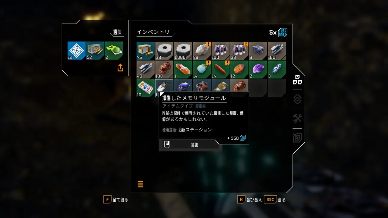 インベントリに収納されたアイテムは、個人用格納箱やストレージデポ v.1など移し替えて保管することができる。なお、レールに接続するタイプのストレージには資源タイプのアイテムしか保管できない。