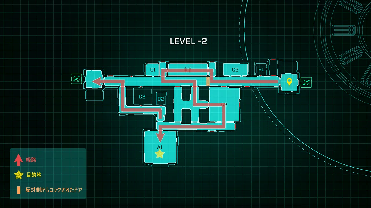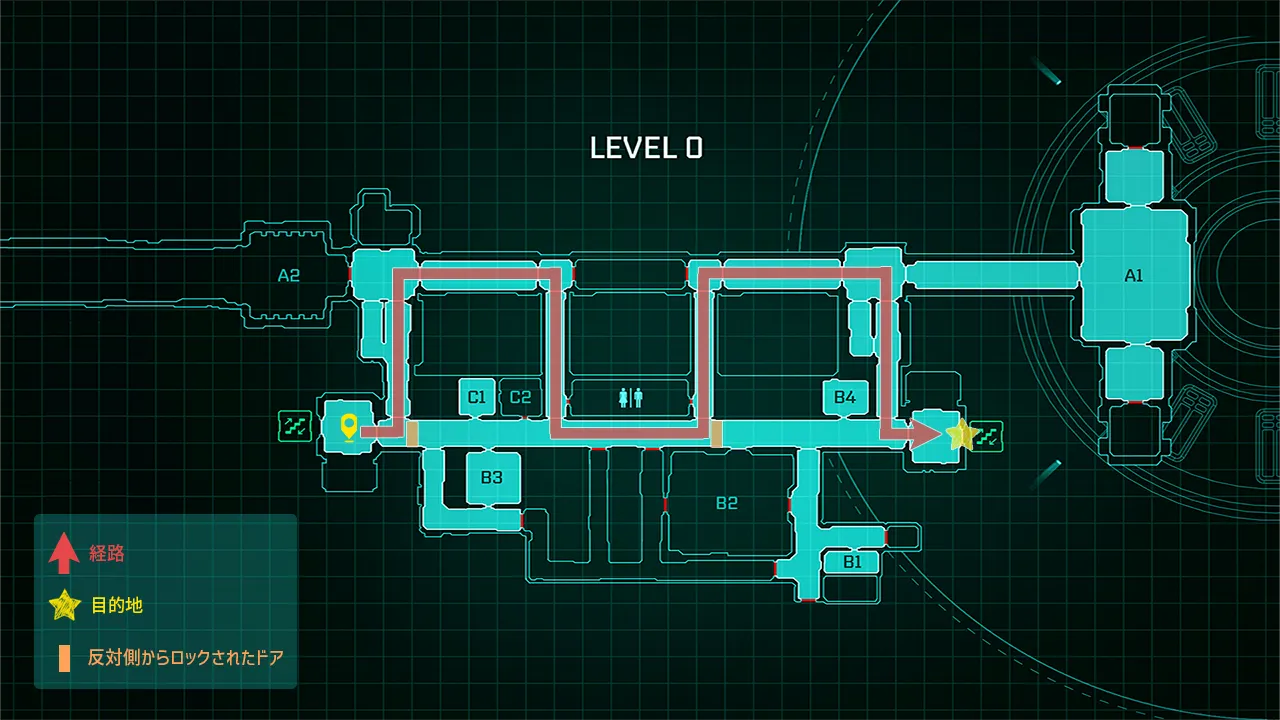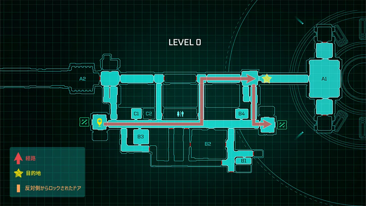 メインエンジンフロアに付いたら北階段を目指して通路を進む。通路は一部閉鎖されていて直進はできないため、画像のような経路で目的地に向かう。封鎖されたドアの一部は反対側から開けることができるので、帰りは一直線に進むことができる。