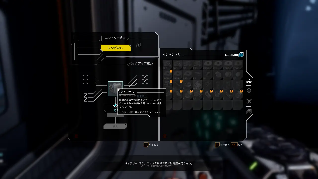 パワーセルを1つ投入して「挿入」ボタンを押すとゲートが開いて中に入れるようになる。