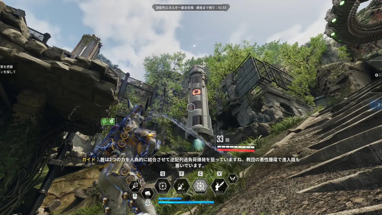 演算装置の起動に成功した場合、20秒間、通路を塞いでいる障壁にダメージが通るようになる。時間内に障壁を生成している4つの装置を破壊できれば、先に進めるようになる。20秒が経過してしまった場合は、もう一度同じ手順で演算装置を起動する必要がある。