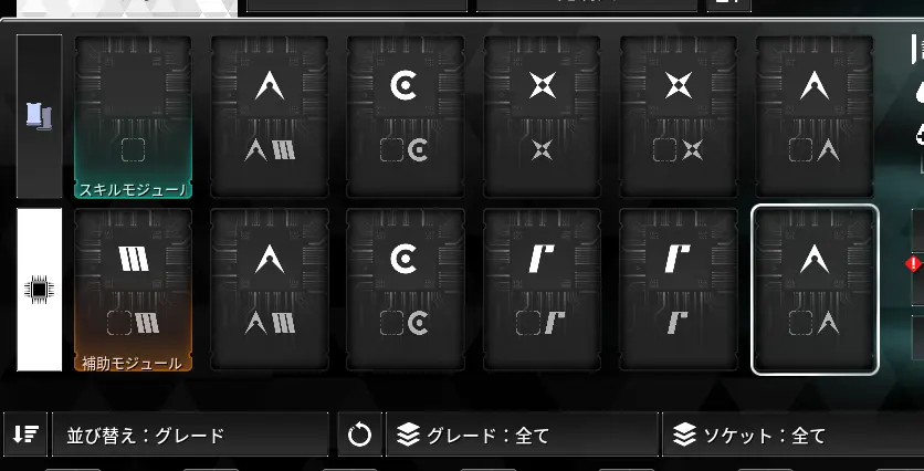 モジュールの設定画面では、画面上に対象のモジュールスロット、下に所持しているモジュールの一覧が表示される。スロットや容量が上限に達していなければ、一覧から装着したいモジュールを選択することでスロットにモジュールを装着することができる。所持しているモジュールはソートやフィルター、検索機能などを使用して絞り込むことも可能。