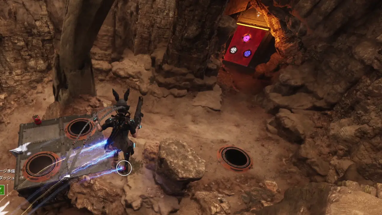 次に空中に指示された足場があるので、グラップリングフックを使ってそれに乗る。すると、足場に乗っている間は周囲の地面に設置されたパネルにシンボルが表示されるので、障壁に描かれているシンボルと同じ色のパネルを探し、それらを全て占領する。