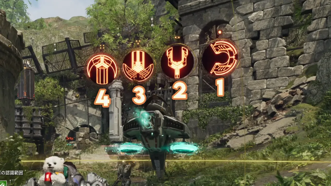 シンボルを2~4個見つけたら、次は周辺を彷徨いているドローンに注目する。ドローンの上には4つのシンボルが表示されており、さらに各シンボルの上には小さな点が打ってある。シンボルとその点の数を見て、それらが容器に表示されていたシンボルと上から数えた時の番号にすべて一致していたら、そのドローンをインタラクトする。