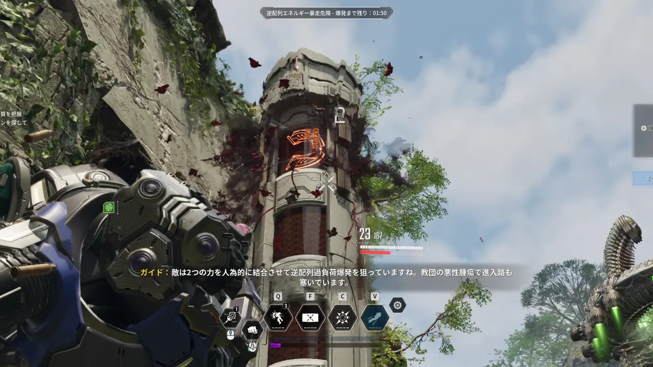 インタラクト後、ドローンから離れたり、またはそのドローンが間違いだった場合は爆発して即死する。正解のドローンだった場合は、ドローンから専用武器を入手できる。専用武器を拾ったらエリアを塞いでいる壁まで行き、壁についている目玉3つを専用武器で撃って破壊する。専用武器は6発撃つことができ、目玉はそれぞれ3発で破壊できる。つまり、先に進むにはこのギミックを2回繰り返す必要がある。