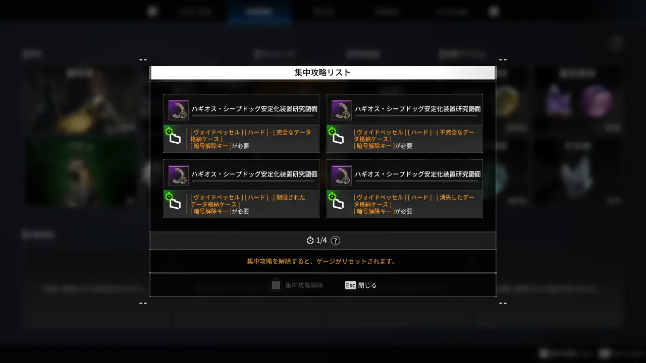 現時点で集中攻略の対象として指定できるのは、主にミッション報酬のメイン素材とアモルファスのみで、アモルファスから獲得するアイテムは指定できない。