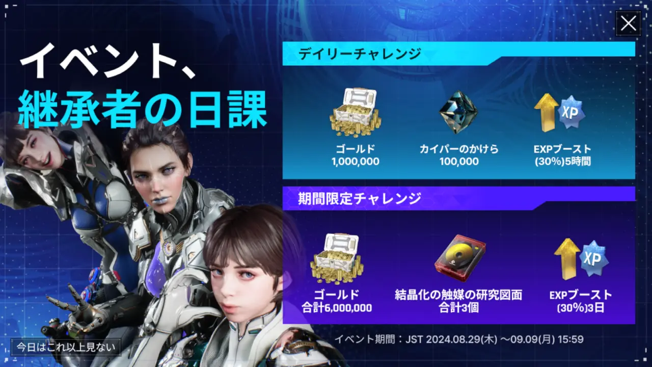 | 1月25日 16:00 ~ 1月26日 15:59 | ヴォイド深層部の金属片 x1,000 ゴールドブースト 1日 (30%) カイパーのかけらブースト 1日 (30%) 継承者EXPブースト 1日 (30%) 武器熟練度ブースト 1日 (30%) 精密イオン加速器 x50 精密調整制御軸 x250 ゴールド x2,025,000 カイパーのかけら x202,500 | 2月1日 16:00 |