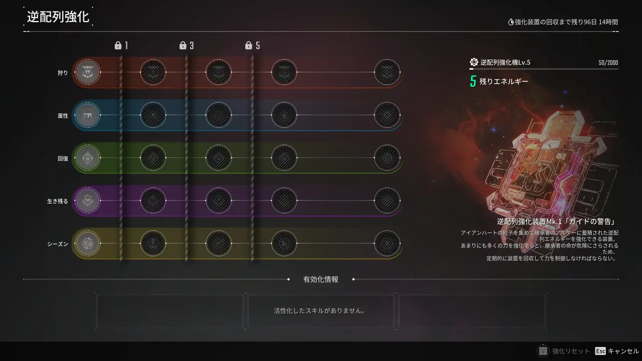 逆配列強化はシーズン1で追加された継承者の新たな成長・強化要素。レベルやアンロックなどの進捗は、各シーズン期間が終了する毎にリセットされる。逆配列強化のメニューはインベントリ画面からアクセス可能。