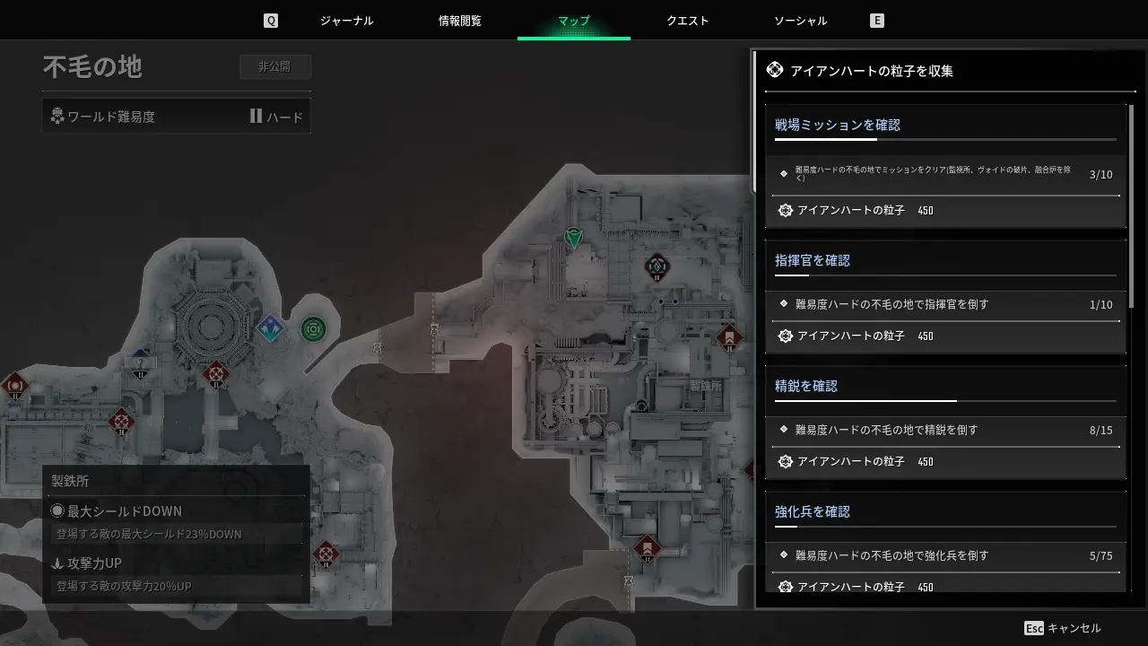 アイアンハートの粒子収集状況」という欄が表示され、それを選択すると収集クエストの一覧が表示される。収集クエストは地域ごとにそれぞれ独立している。