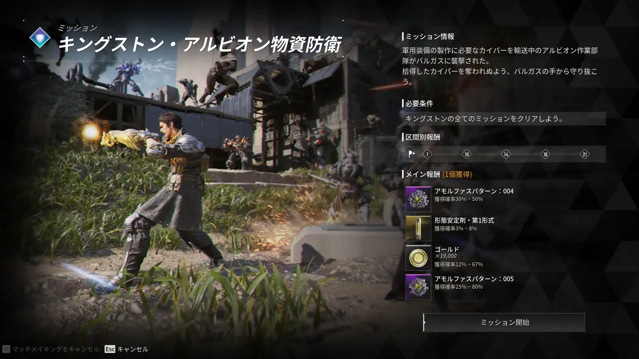 また、一定のウェーブをクリアする毎に抽選で非定型素材やゴールドといった報酬を受け取ることができ、その際そのままミッションを継続するか、あるいはミッションを中断してアルビオンへと帰還するかを選択できる。基本的に後半になるほどいい報酬が手に入りやすくなる。