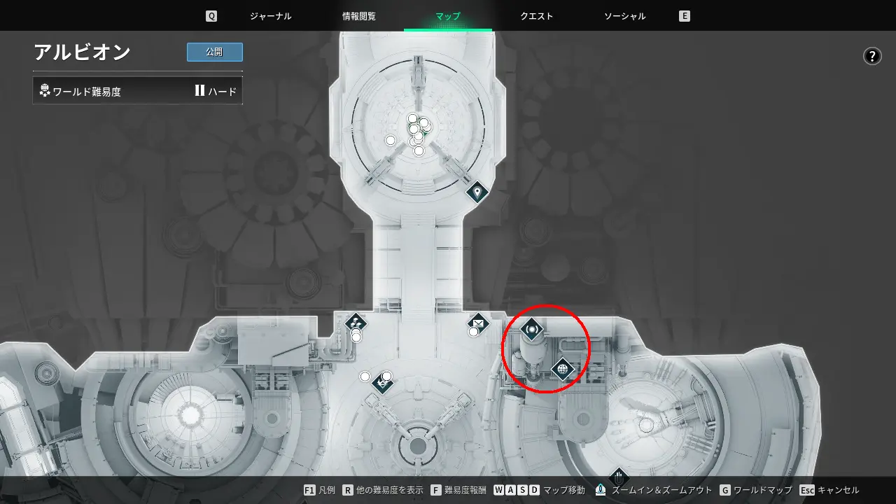 それぞれのミッションにアクセスできる端末は、アルビオン入口から通路を進み、広場に出て左を見たところにある。