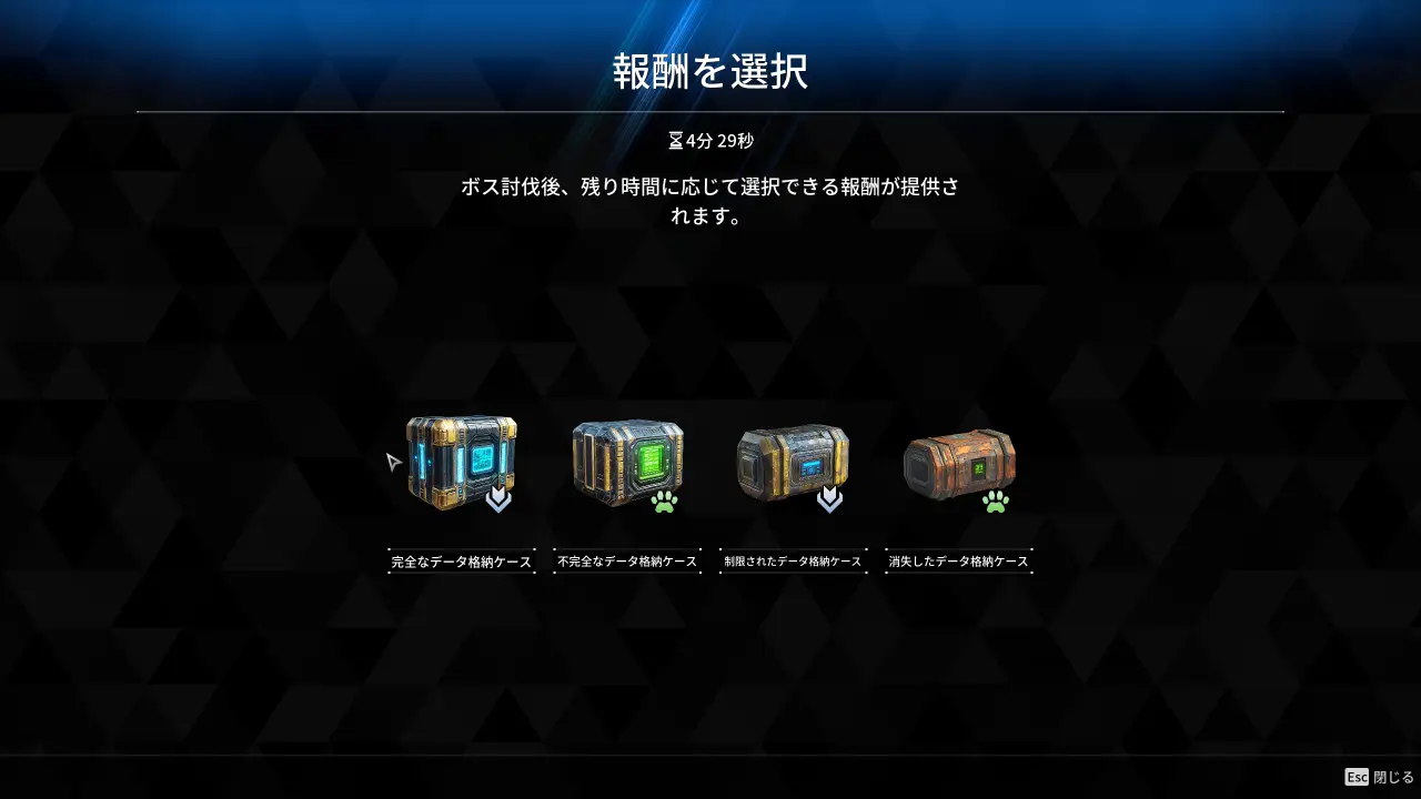 また、ボスを倒した際の残り時間に応じて、追加のコンテナ報酬を得ることができる。ボスを時間内に撃破できれば、最大4つのコンテナから1つを選ぶことができ、時間が経過して報酬のランクが下がるにつれ、選べるコンテナの数が減ってゆく。