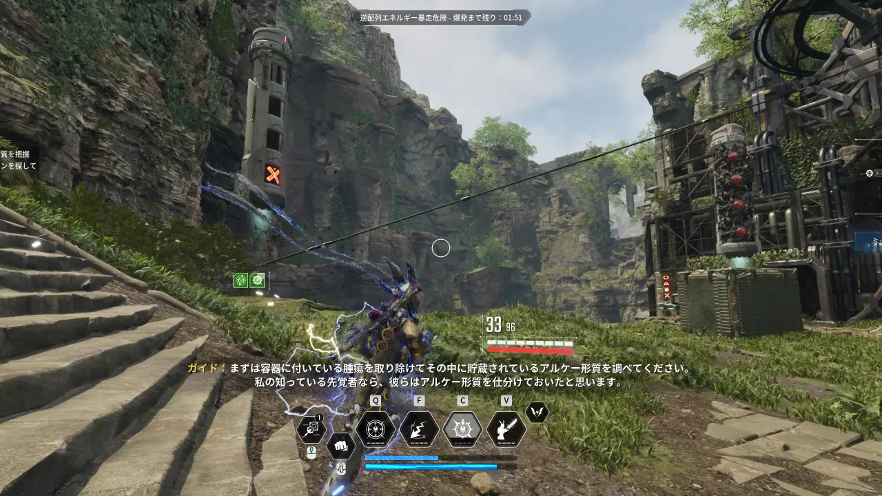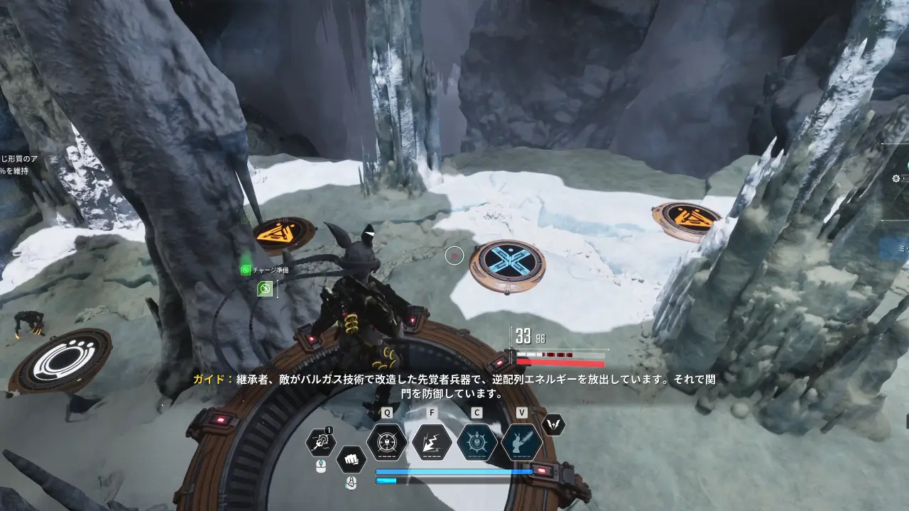 次に空中に指示された足場があるので、グラップリングフックを使ってそれに乗る。すると、足場に乗っている間は周囲の地面に設置されたパネルにシンボルが表示されるので、障壁に描かれているものと同じシンボルのパネルを探し、それらを全て占領する。